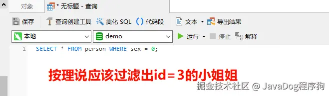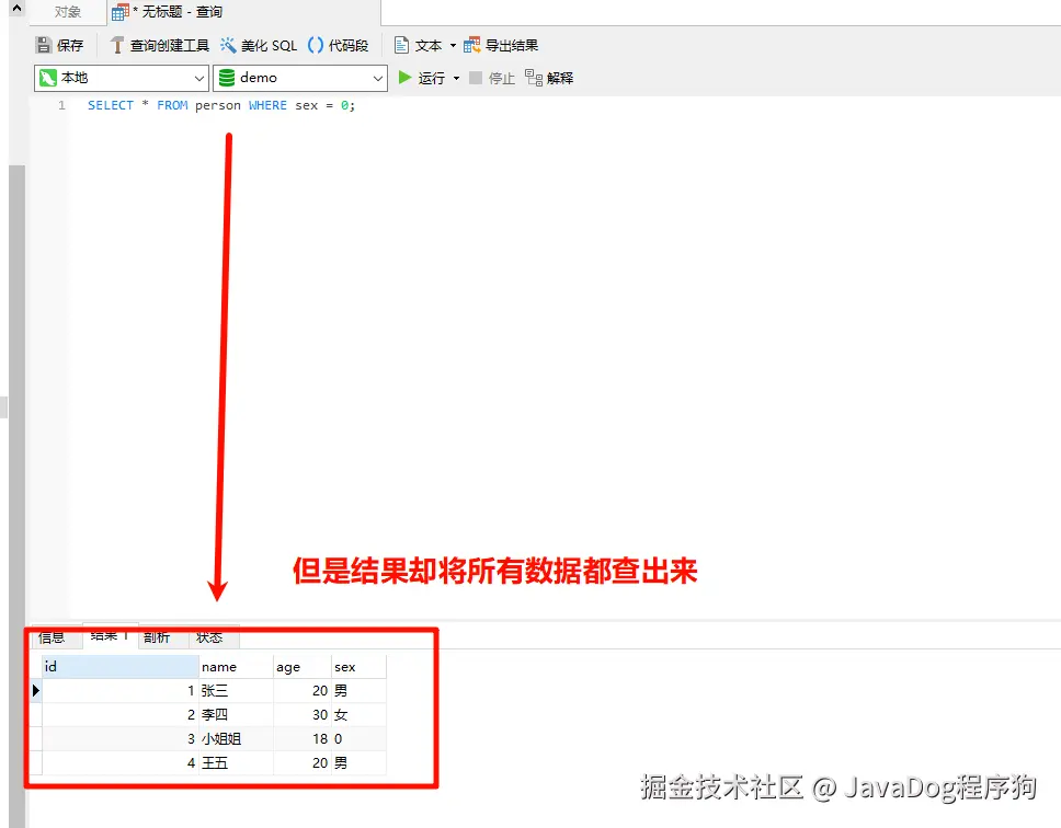 - 查询 SELECT * FROM person WHERE sex = 0; 返回所有数据,而非仅 '0'。