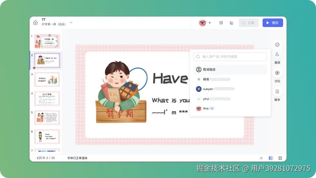 彩漩 PPT 支持 多人多端协作,无论是与同事、学生或家长都能随时随地协同编辑,让沟通与教学准备变得更加高效。