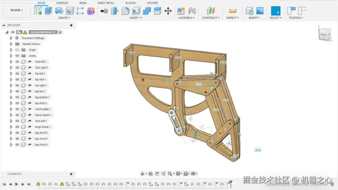 三轴 CNC 只能从顶部去除材料。但是由于许多零件也需要从底部和 / 或侧面移除材料,以制造更复杂的形状和凹陷,作者将大部分腿部零件设计成由三片层压竹子制成,他可以分别加工每层竹子,然后将其粘合在一起。