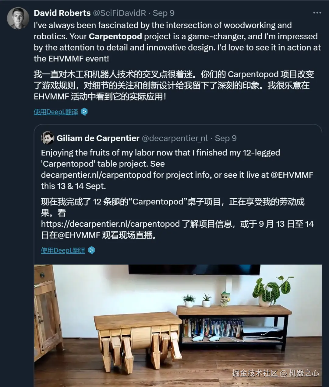 这种机器人技术与木工的结合令人眼前一亮。作者 @Giliam de Carpentier 表示将参加近期的一个活动,届时会做更多介绍。