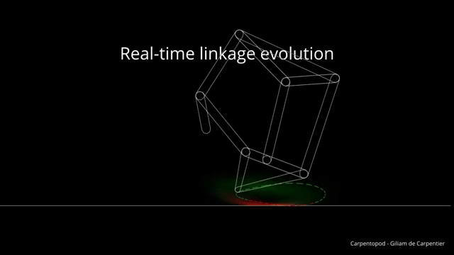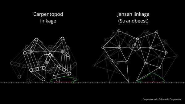 看过 Theo Jansen 鼓舞人心的 Strandbeest 雕塑的人可能都会发现,他的雕塑的腿部连杆机构与 Carpentopod 连杆机构十分相似。但 Carpentopod 的连杆具有一套完全不同的组件比率,以及一个额外的关节点和一个进化过的圆形脚趾直径。这些额外的参数使得进化过程能够找到一种更紧凑、减少脚部滑动的解决方案。