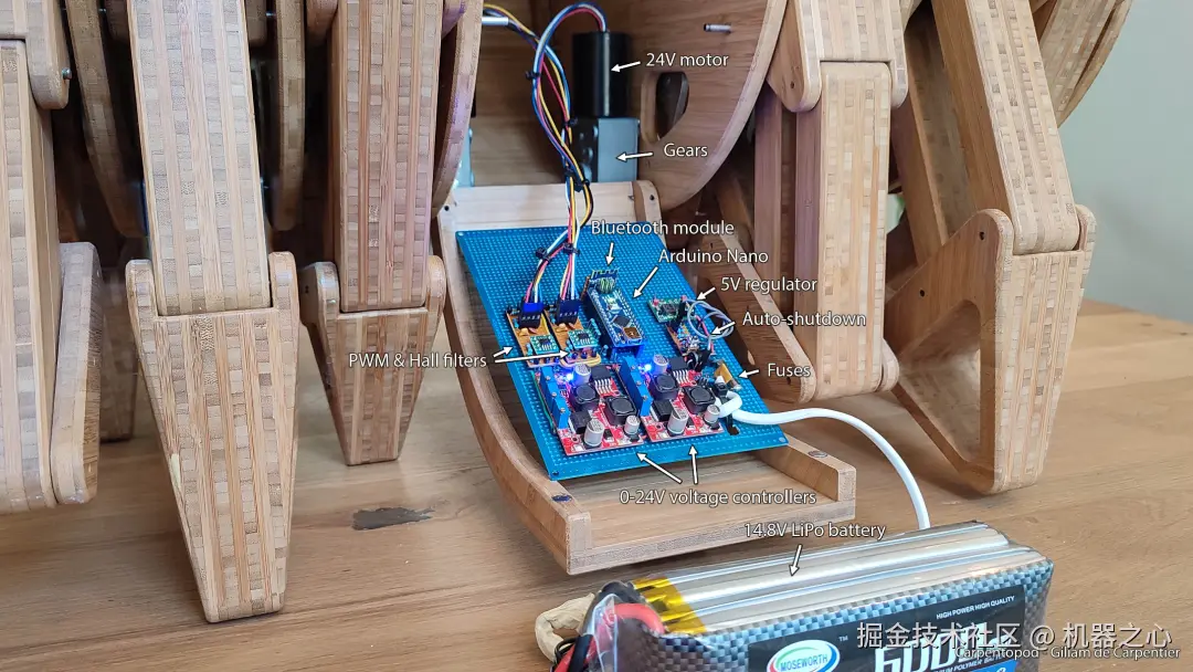 为了让它自行移动,作者订购了两个便宜的齿轮驱动的 24V 无刷电机,这类电机通常用于自动窗帘,输出最大 1.5 Nm @ 130 RPM。它们内置的电子设备还允许使用额外的 PWM 信号线直接控制速度。遗憾的是,当尝试让它们低速运行时,电机几乎立即进入了一种因温度过高而自动持续几秒的关机保护模式,即使仅在极小的负载下也是如此。幸运的是,将 PWM 信号保持在 100%,并直接改变电压,情况就好多了。如下图所示,作者直接将可调试的实验室电源连接到其中一个六腿部分的电机上。