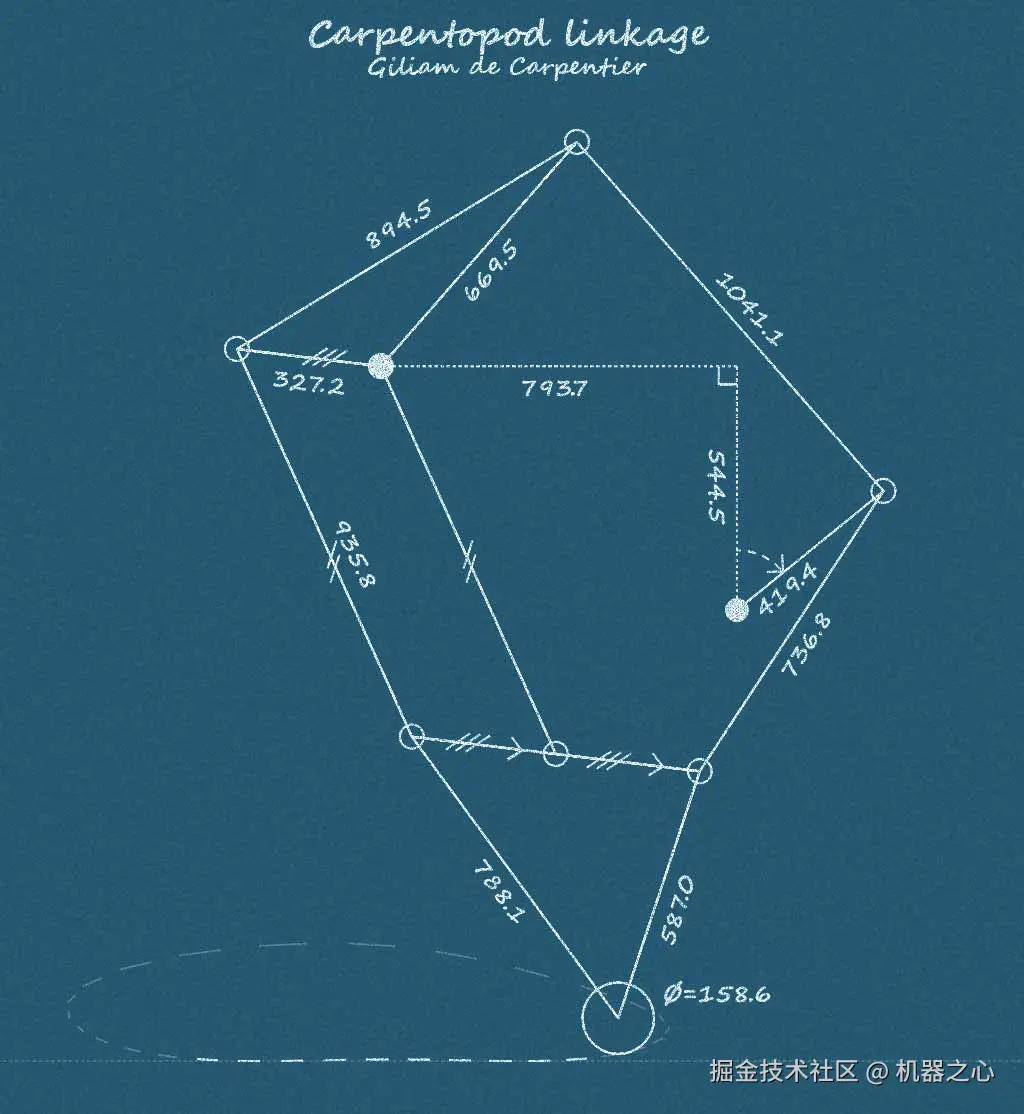 Carpentopod 腿部连杆是由作者编写的软件生成的。这个软件让数千个虚拟腿部变体进行竞争,以此进化。为了挑选出最佳的变体,每个变体都被赋予一个基于其行走速度、间隙和材料使用的「适应度」分数。在行走周期中最低的三分之一阶段,作者额外奖励了那些腿尖能更水平和更平滑移动的变体。这样的设计有助于三条腿协同作用,以最大程度减少行走时的晃动和足滑。