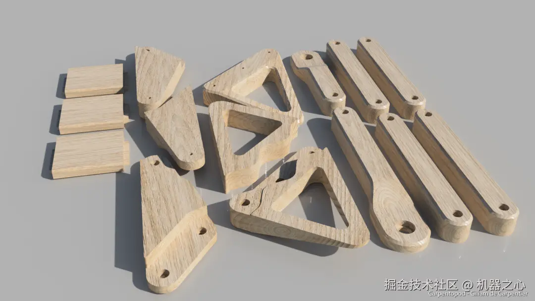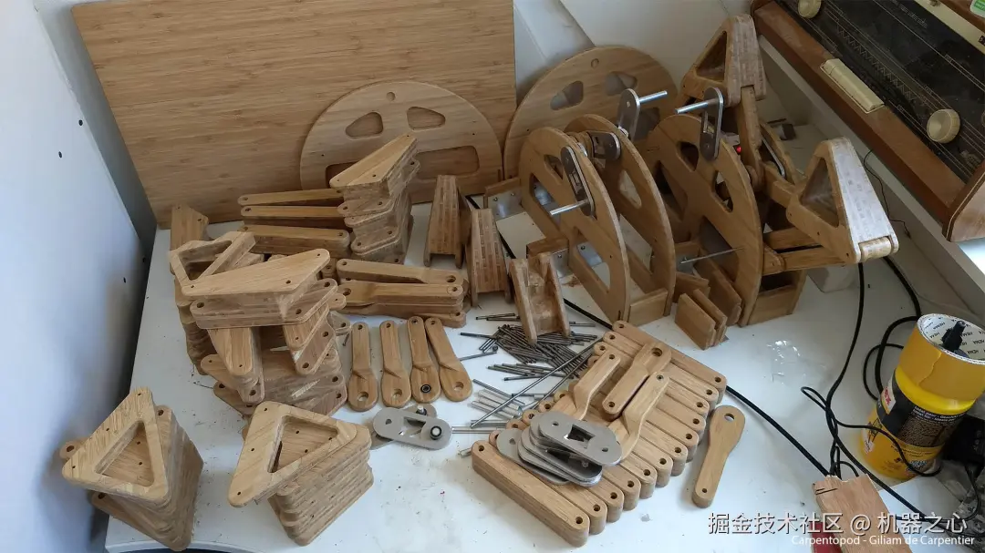 接下来,他决定制作一个可以行走的木制咖啡桌,因为他认为这既实用又具有美观价值。由于 Carpentopod 连杆中的每个独立腿部只占行走周期的三分之一,因此这个桌子本身需要十二条腿以保持稳定。为了保证行走的平滑性,腿部组件也需要以亚毫米级的精度制作并维持这种状态。这就是作者选择用层压竹板进行 CNC 加工的原因,这种材料坚固、自然、耐用且稳定,非常适合将机械元素与有机风格结合起来。