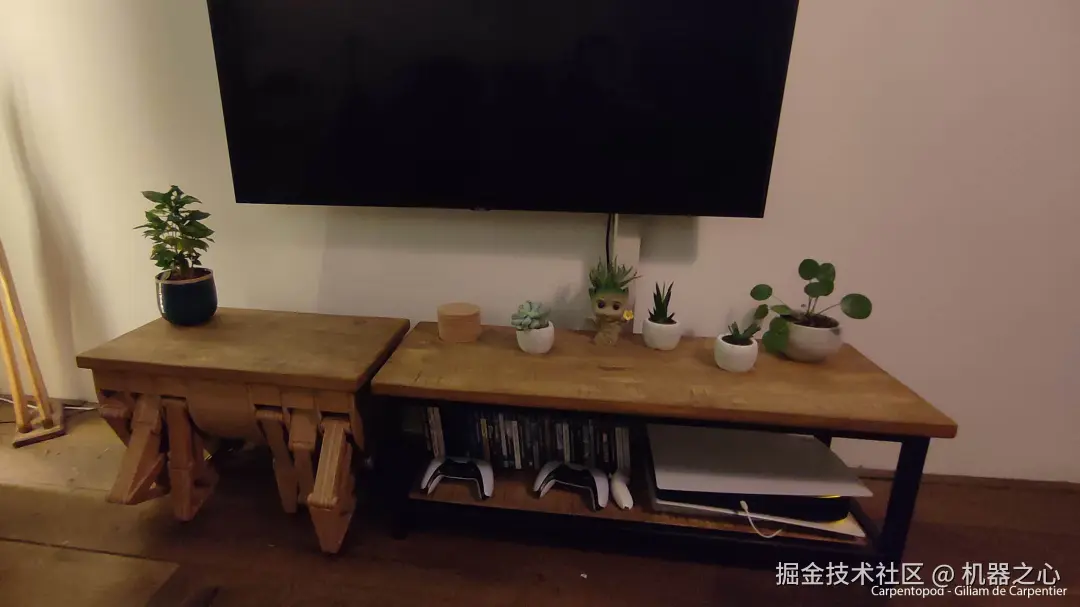 整个桌子有 12 条腿,里面内置了电机,是木工、电子和编程结合的产物。只要按下遥控器,桌子就会向你走来,像一个家用机器人一样。