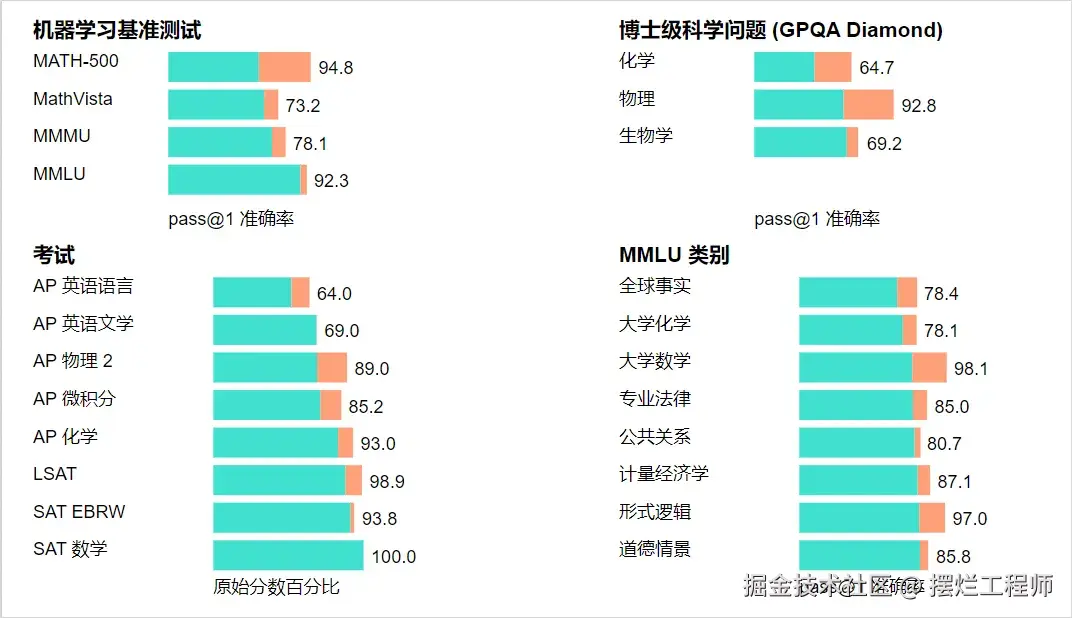 (3)在博士级科学问题上:GPT-4o的准确率为56.1%,人类专家水平的准确率为69.7%, o1的准确率达到了惊人的78%