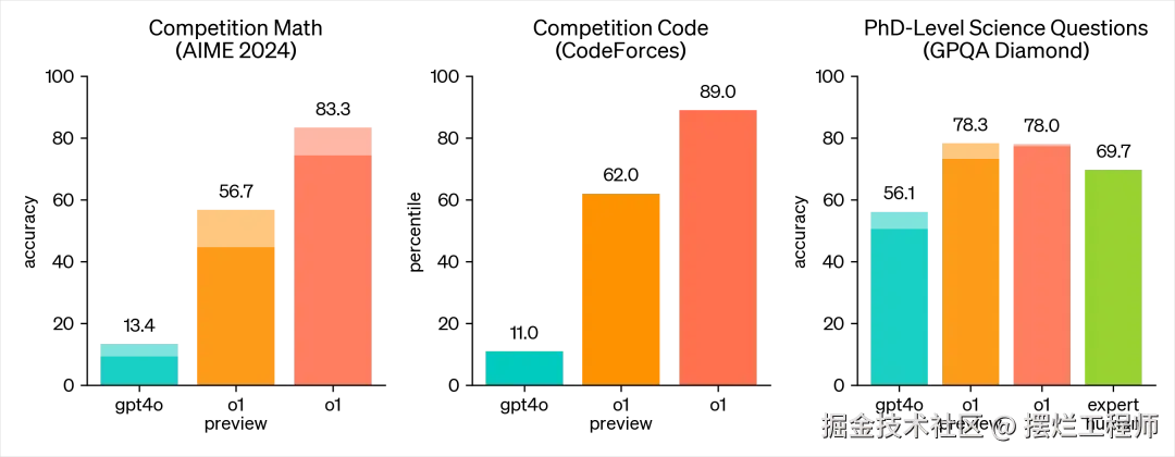 (1)在数学竞赛上:GPT-4o的准确率为13.4%,o1 预览版的准确率为56.7%, o1正式版,准确率为83.3%。