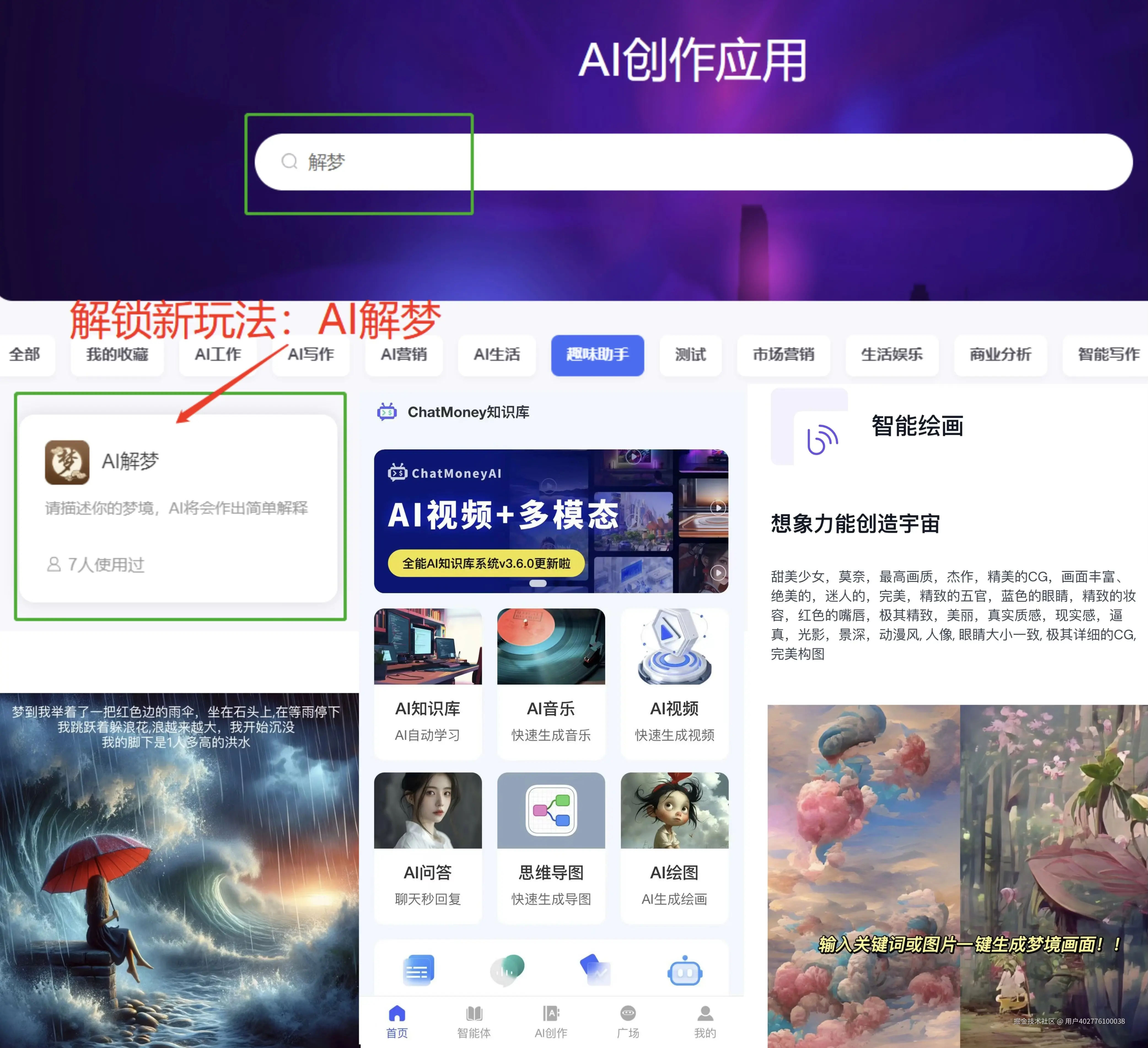 作为一个爱幻想爱做白日梦的 i人,我常常就在想,什么时候能利用Al来帮助我找回一些被遗忘的、或者模糊不清的记忆? 有没有可能进入别人的梦境里瞧一瞧? 为什么世界上还有这么多的冲突和摩擦? 是不是因为人与人之间能够达到的共情和理解还不够? 于是,我们衍生了ChatmoneyAI解梦的应用场景。它能够深入解析你的梦境,揭开隐藏在梦中的内心情感和潜在欲望,让你更加了解自己。