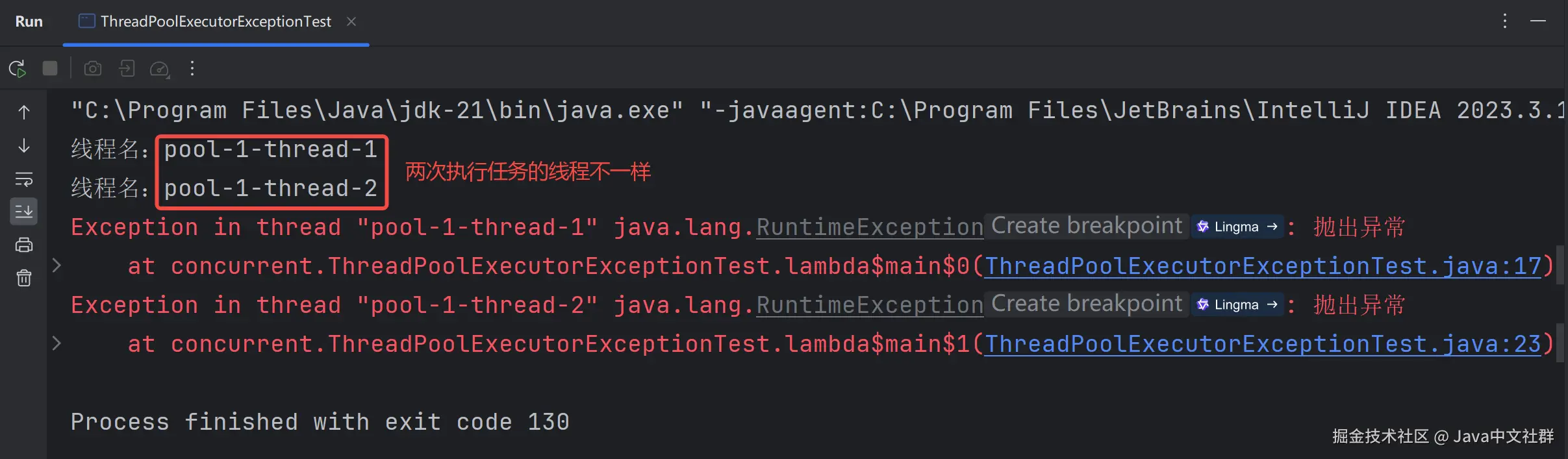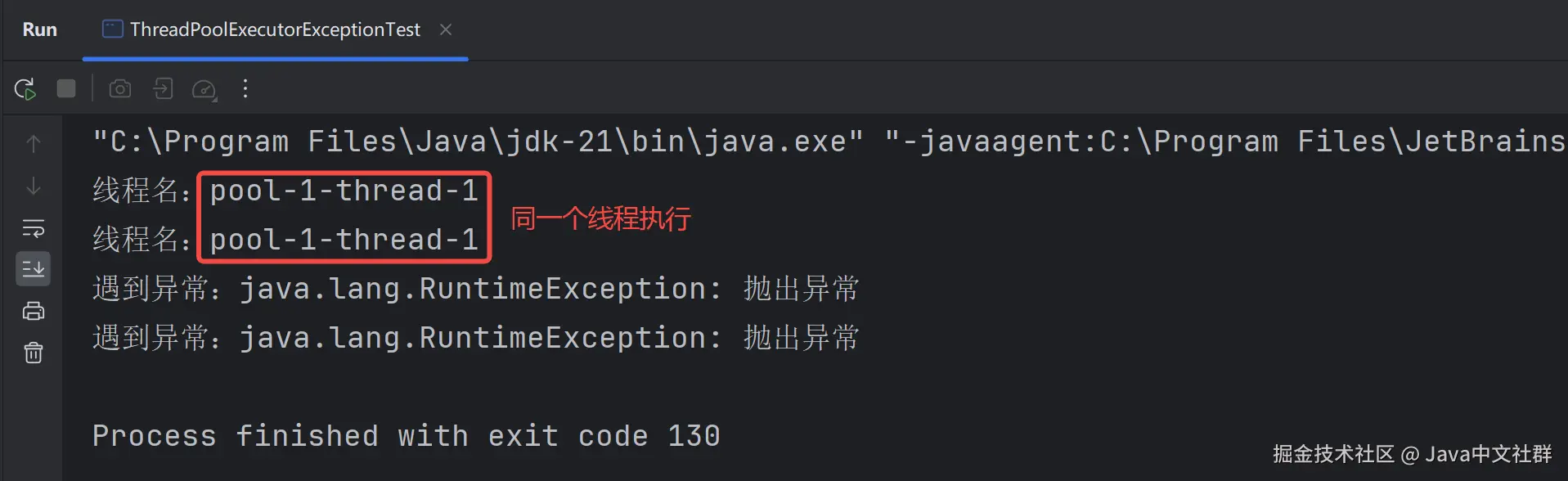 从上述结果可以看出,线程池中的核心和最大线程数都为 1 的情况下,到遇到未处理的异常时,执行任务的线程却不一样,这说明了:当使用 execute 方法时,如果遇到未处理的异常,会抛出未捕获的异常,并将当前线程进行销毁。