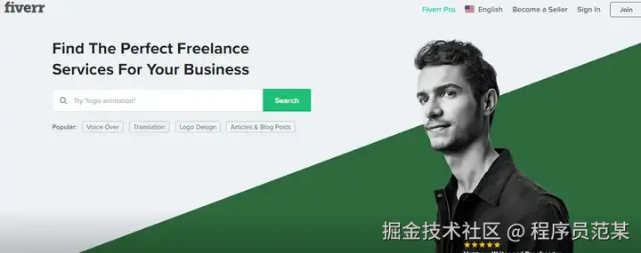 Fiverr也是一个自由远程工作的接单平台,它的特色在于其独特的定价模式,大多数服务起价为5美元,允许自由职业者根据服务内容和质量自行设定价格。Fiverr的入门门槛相对较低,适合新手程序员积累经验,同时fiverr的知名度和用户基数也是非常可观的,对于初次尝试远程工作的程序员也非常友好。