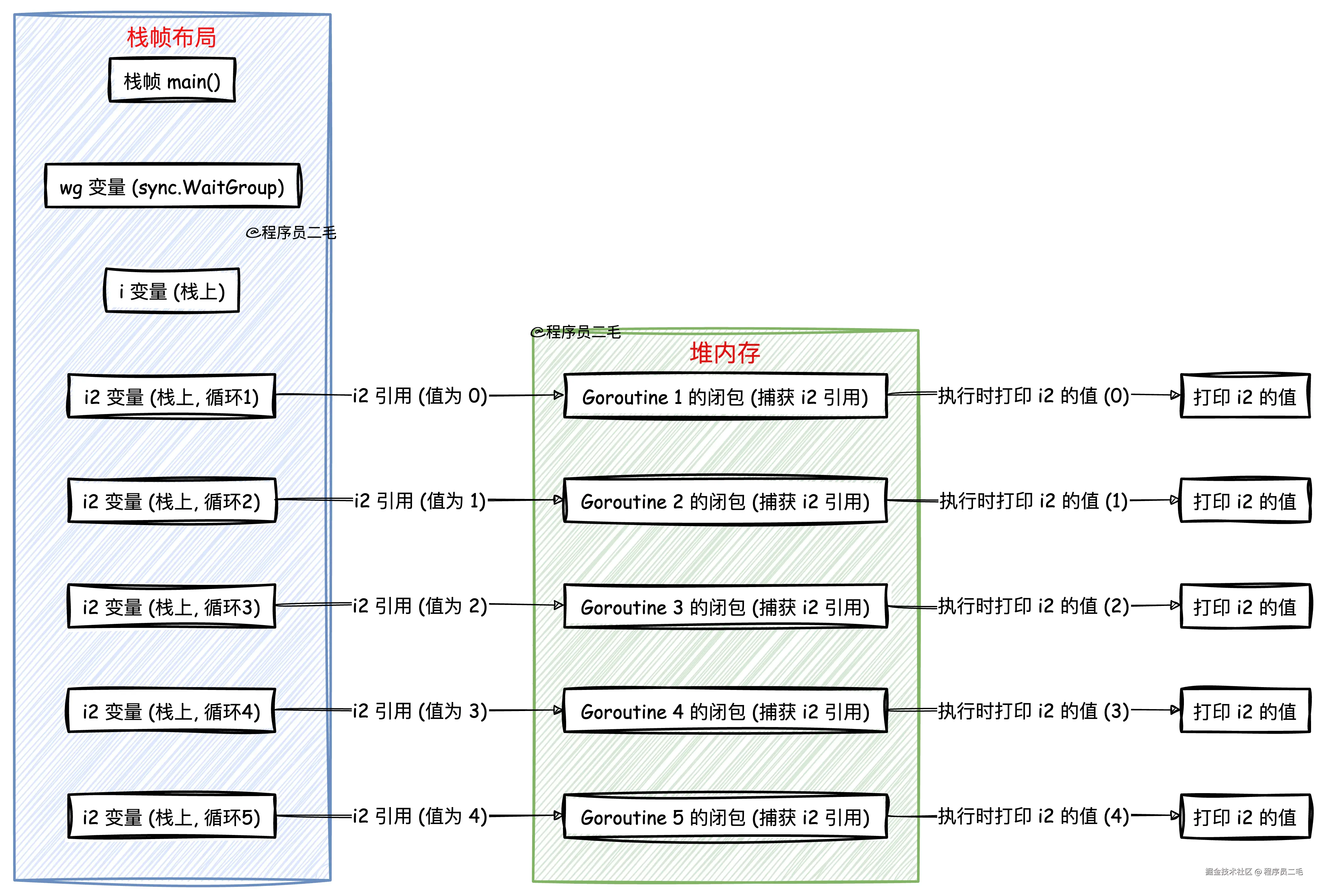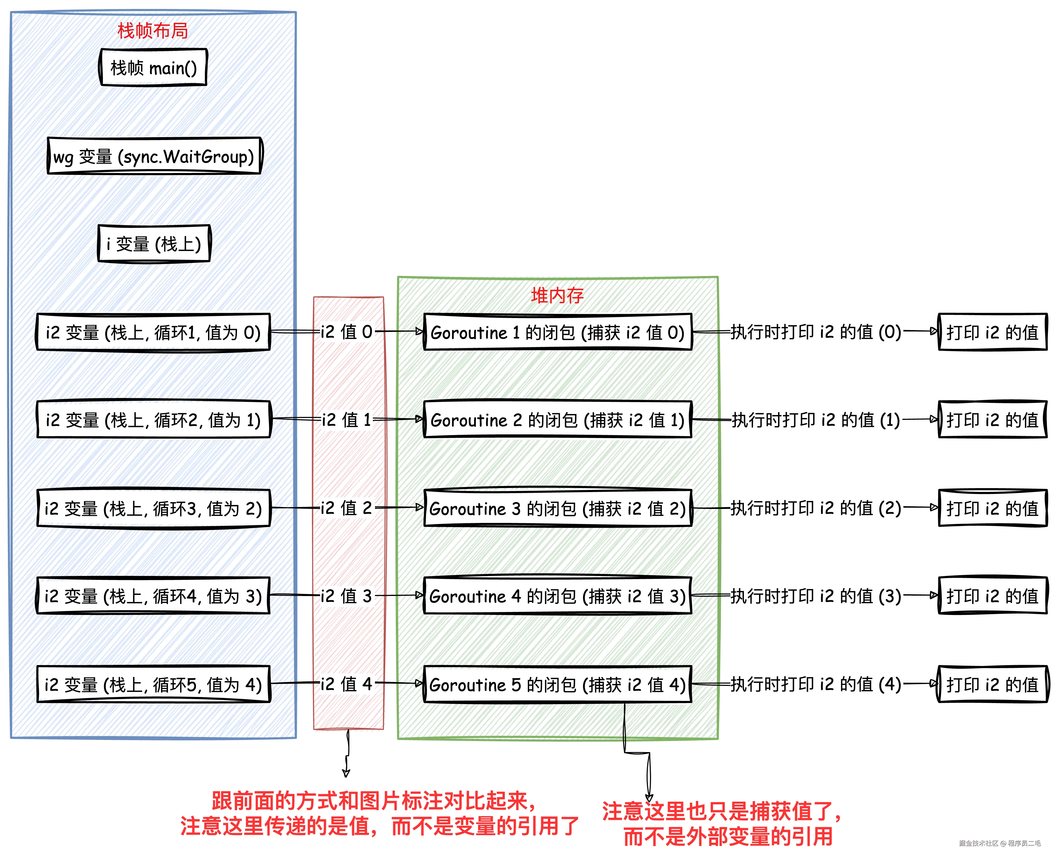 如上,仍然是闭包,但引入了局部变量,此时捕获外部变量的引用,i2 都是不同的对象,每个 goroutine 都独有一份 i2 不会产生数据竞态。