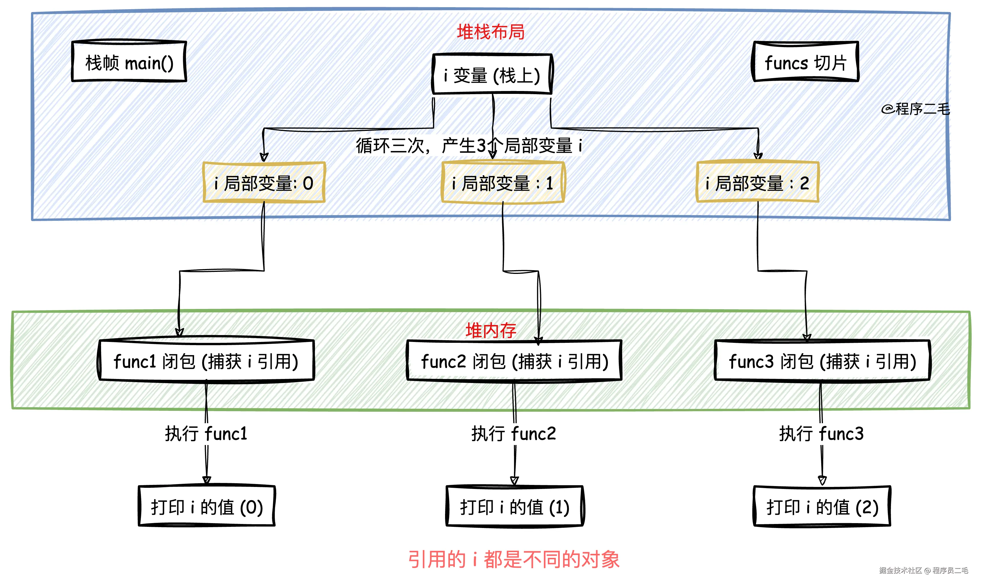 在Go中,for循环中的变量通常分配在栈上。每次迭代时,这些变量可能被重新赋值,甚至在某些情况下被移至堆上,特别是在闭包中使用时。