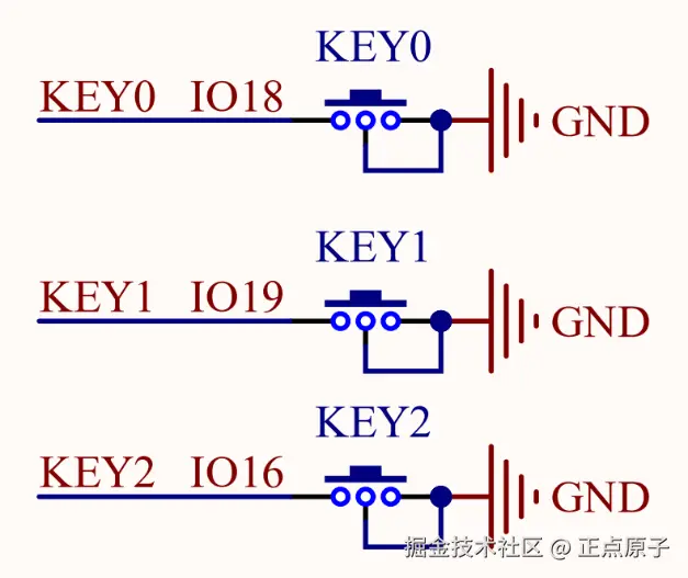 通过以上原理图可以看出,KEY0按键、KEY1按键和KEY2按键对应的IO编号分别为IO18、IO19和IO16,当独立按键没有被按下时,其对应的IO将处于悬空状态,此时读取到的电平将由IO的上下拉决定,当独立按键被按下后,其对应IO的电平将被拉低。