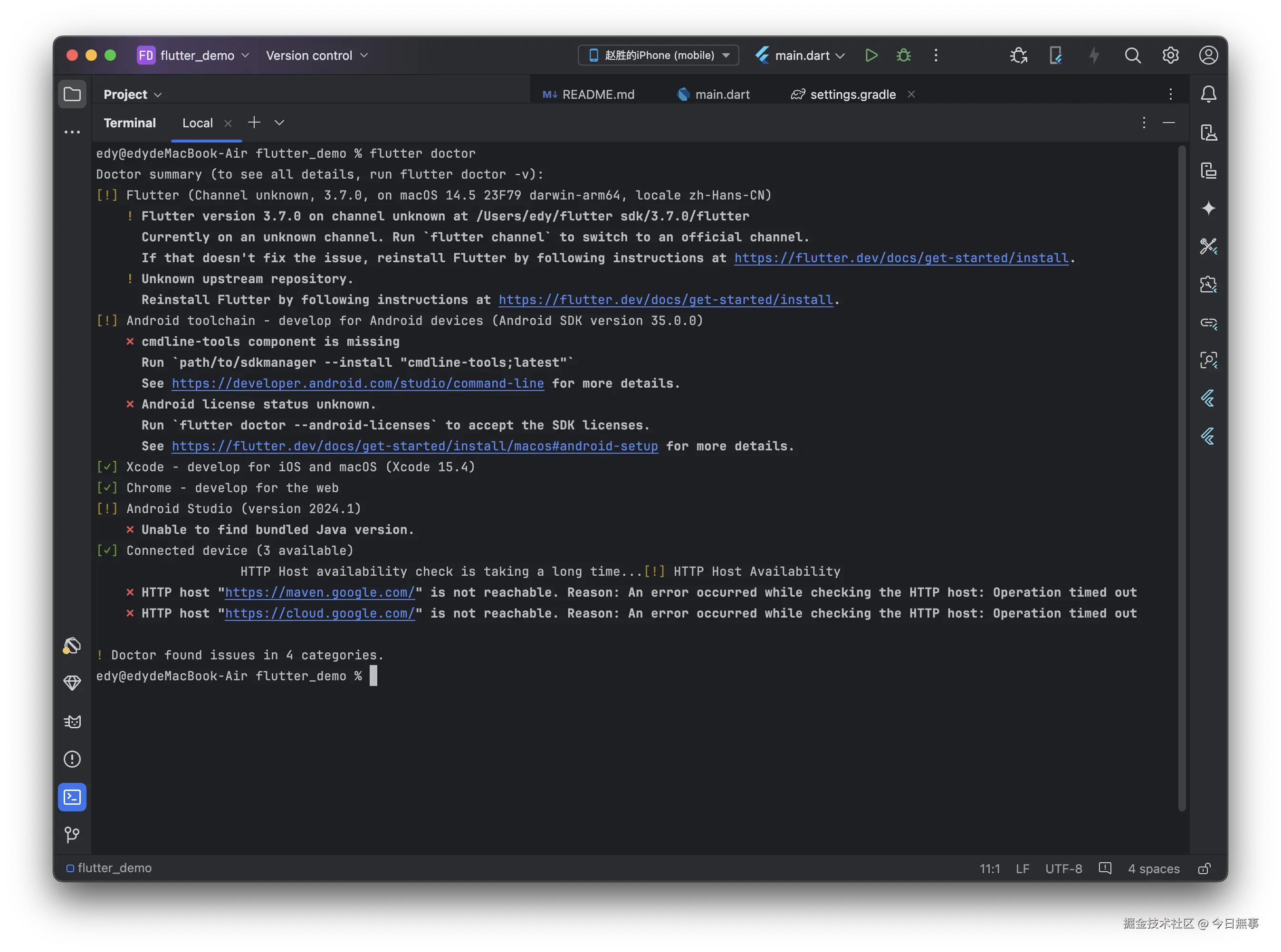 flutter doctor 命令会告诉你Flutter、Dart、Android Studio、Android SDK、Xcode 等是否正常,常见错误情况包括: