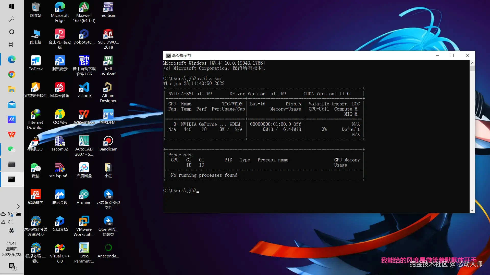 在cmd命令行输入nvida-smi,在第一行右边可以看到CUDA的版本号,我的是11.6版本。