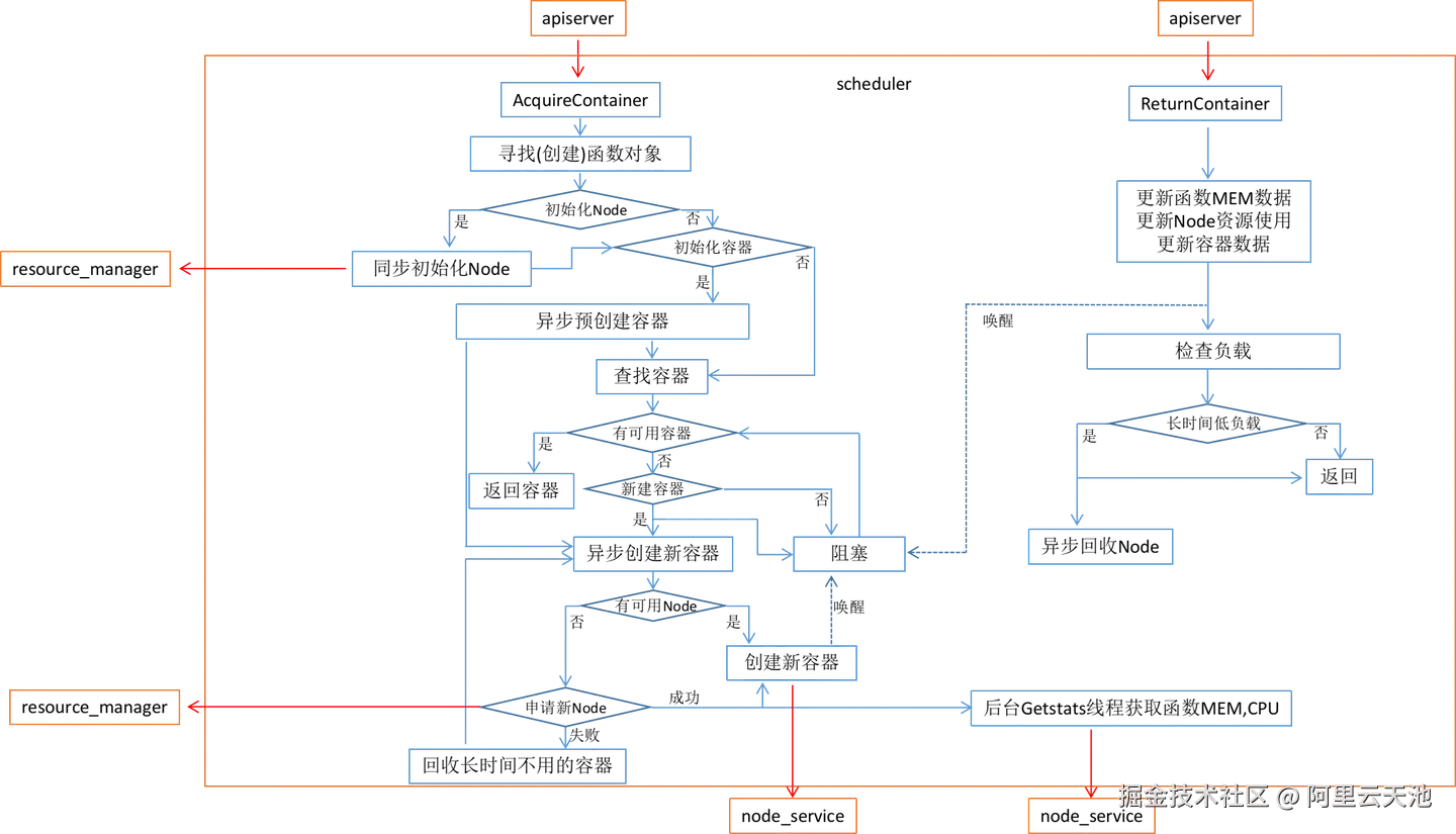 - 选择容器的原则,首先内存必须充⾜,并⾏数量少,Node 上 sleep 型和 CPU 紧密型函数比例保持均衡,Node 上 CPU 使⽤量和 MEM 使⽤量比例保持均衡( scheduler 会在本地记录、更新各个 Node 的 CPU、MEM、并⾏数量等使用详情)。