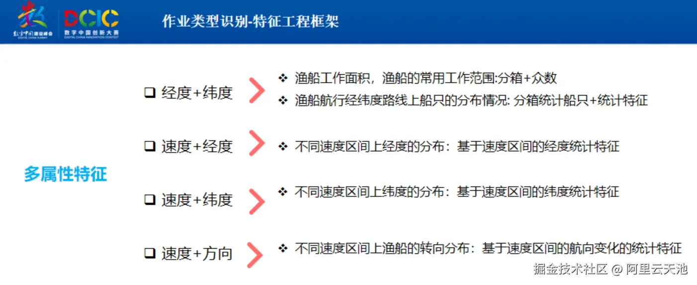 单属性特征,从速度、方向、经纬度等方面,由全局和局部两个方向,从分位数特征、分桶统计特征刻画渔船的基本画像。