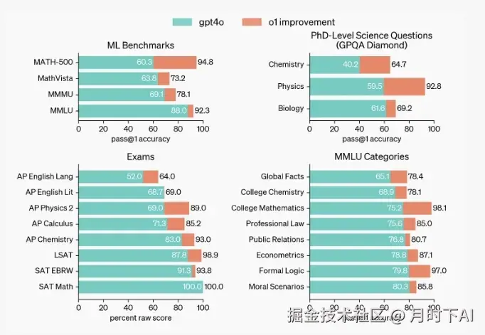 o1-preview模型在编码、数学和安全合规等各个领域均表现良好。它在具有挑战性的任务中表现优于 GPT-4o,并且在避免不允许的内容和幻觉方面表现出显著的进步。