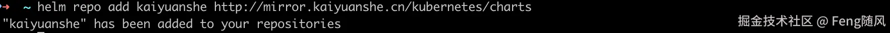 $ helm repo add kaiyuanshe http://mirror.kaiyuanshe.cn/kubernetes/charts