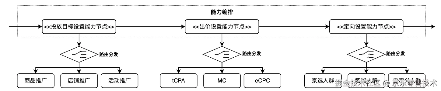 能力节点主要定义了系统中各个原子模块的功能范围。一般来说,一个能力节点通常包含一个能力门面和0到多个能力实例。能力门面并不承接具体的业务逻辑,它的作用是对外暴露统一的调用入口及请求转发,具体的业务逻辑则由能力门面下的能力实例承接。比如出价设置节点下会按照出价类型划分为:手动出价、tCPA智能出价、MC智能出价、eCPC智能出价几个具体的领域能力实例,而在人群定向设置节点下则有京选店铺人群设置、乐高人群设置和自定义人群设置几个领域能力实例。