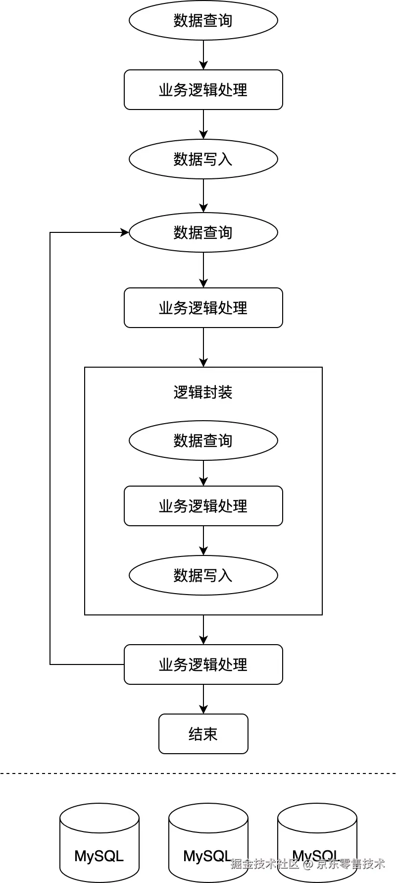 最开始的时候我们的架构如下图所示,这也是我们目前最常见一种代码架构。可以看出它的特点就是“简单”,没有过多的封装和设计,平铺直叙,数据查询和业务逻辑处理互相交织,是面向数据库编程的典型案例。这种架构在早期场景单一、需求简单的阶段可以快速实现功能,没有多余的设计成本,但是随着业务的发展,系统服务的场景越来越多,这套架构就变得越来越不简单了。