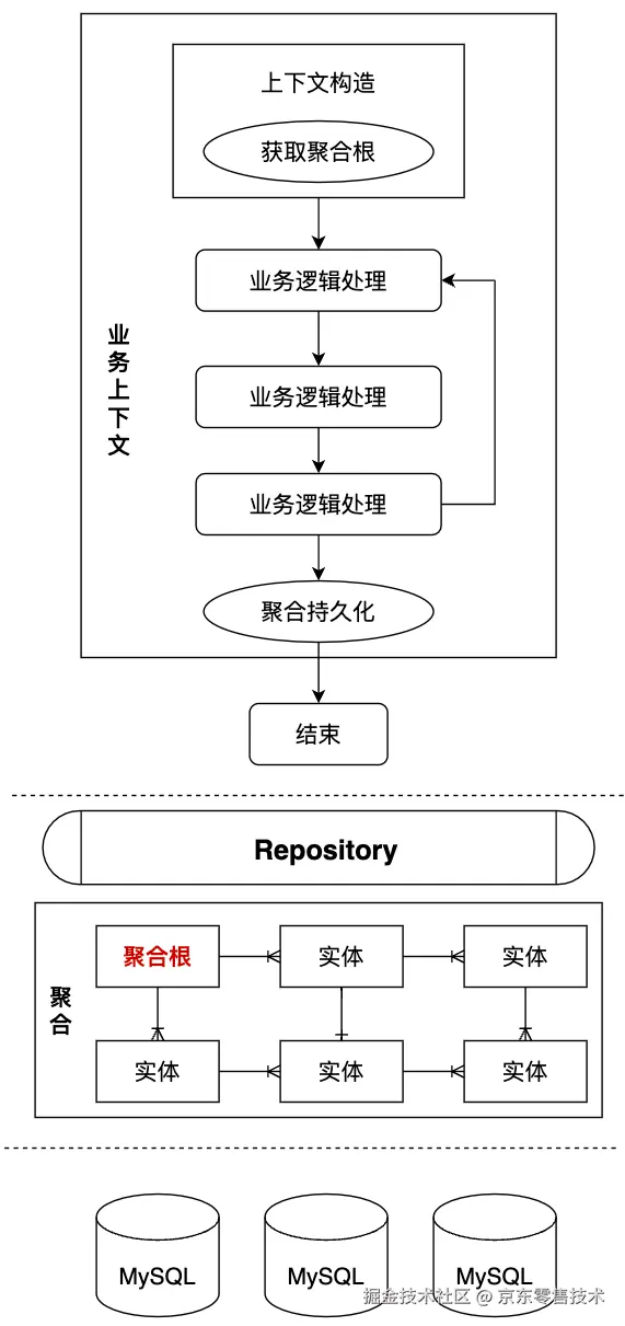 3.上层的业务流程对聚合中实体的访问和修改都是通过聚合根实现的,而要想获取聚合根则必须通过聚合层暴露出来的Repository接口。