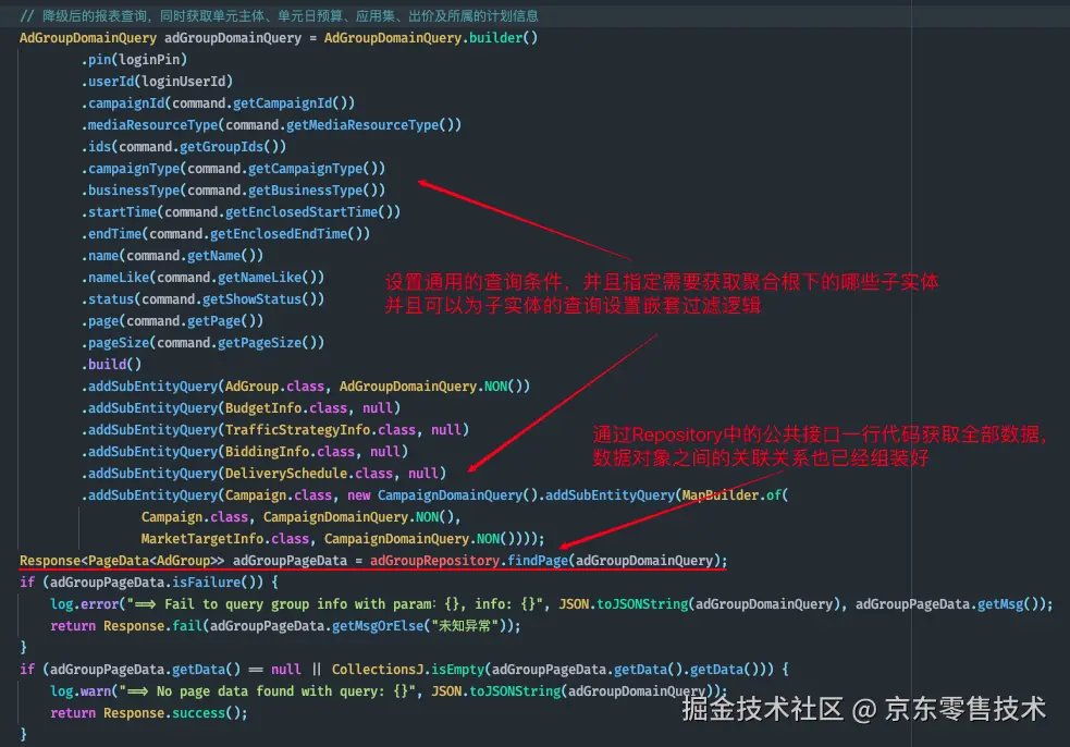 2.在业务流程和底层数据库之间增加一个聚合层,在这一层中将第一步设计的数据模型定义为Java对象,其中实体之间的关系则转化为类与属性的关系。比如AdGroup领域对象内属性除了体现ad_group表中定义的字段之外,也定义了单元下的人群、流量包、创意列表等子实体对应的属性。