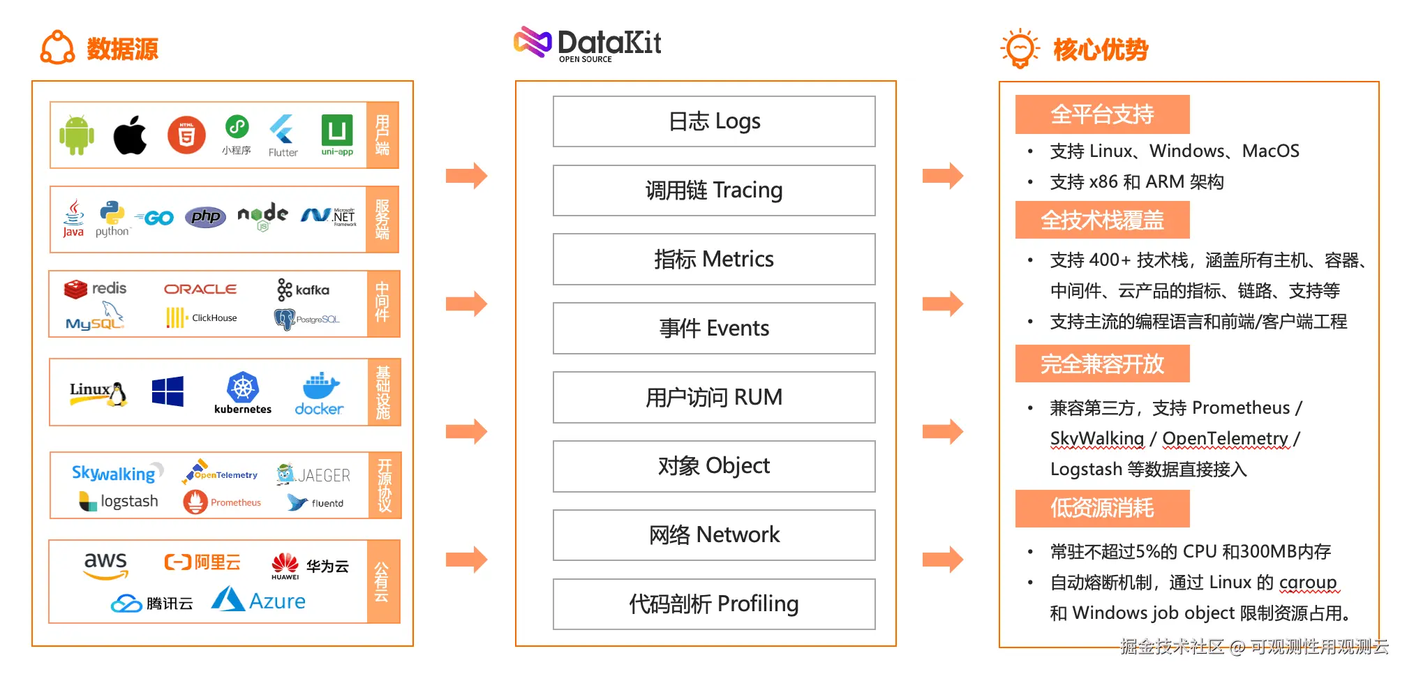 观测云通过提供统一的数据采集套件 Datakit,将业务系统内所有相关的指标、日志、链路及用户访问情况统一采集到平台中。借助数据清洗打标的功能,用户可以在采集时为不同来源的指标、日志等数据定制个性化标签,作为后续成本数据分析的聚合依据,提升成本分析效率。