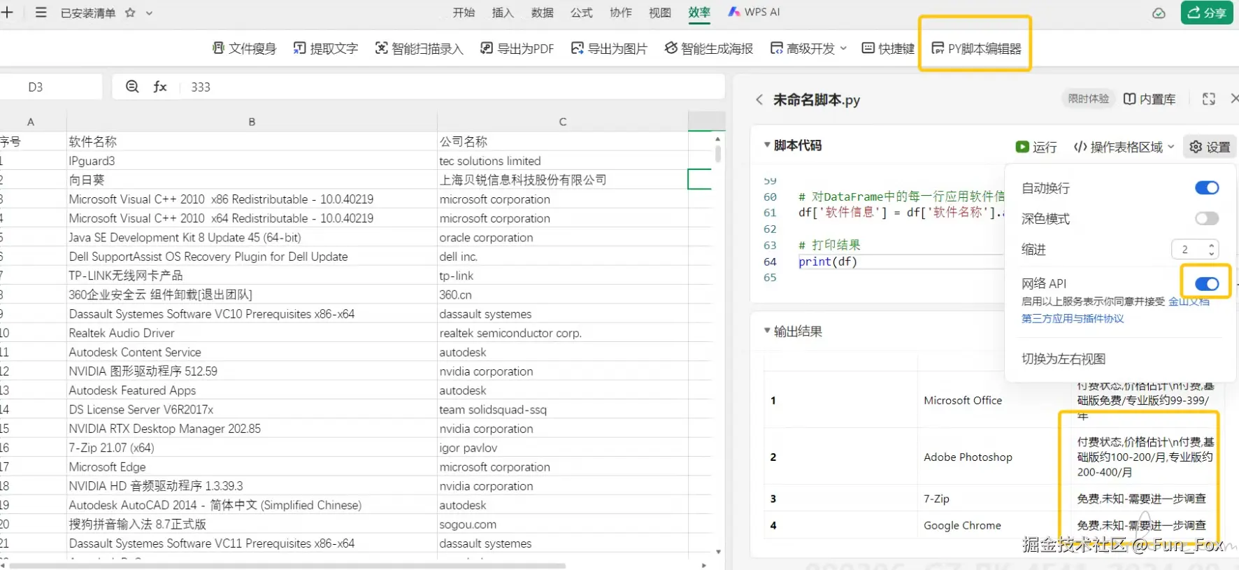 office 由于本人本地电脑没有装,所以想了一个替代方案,用 WPS 云文档的 PY 脚本编辑