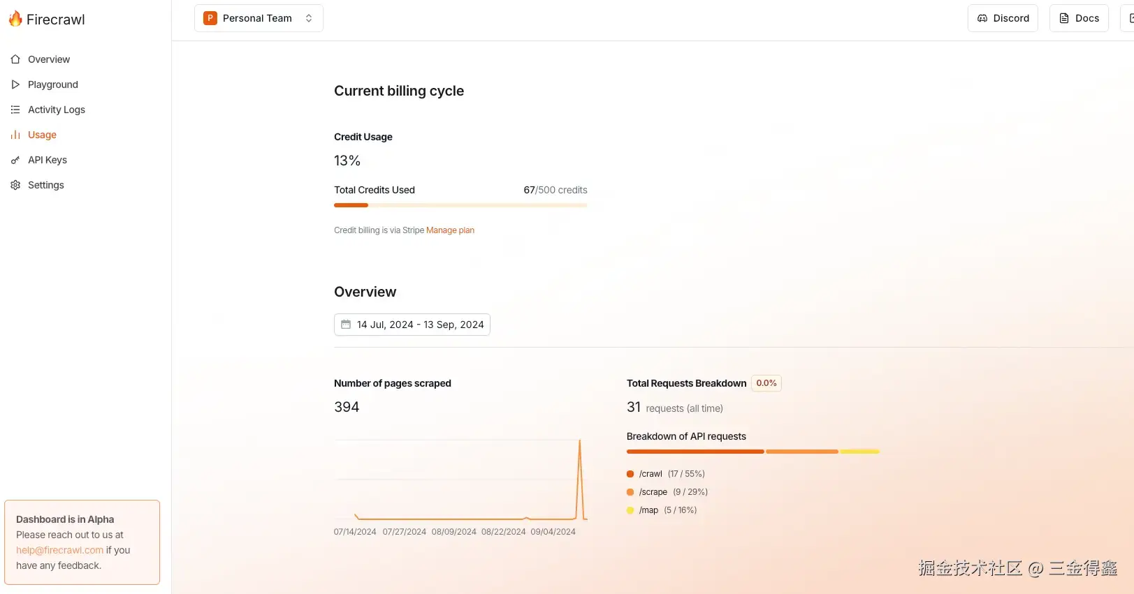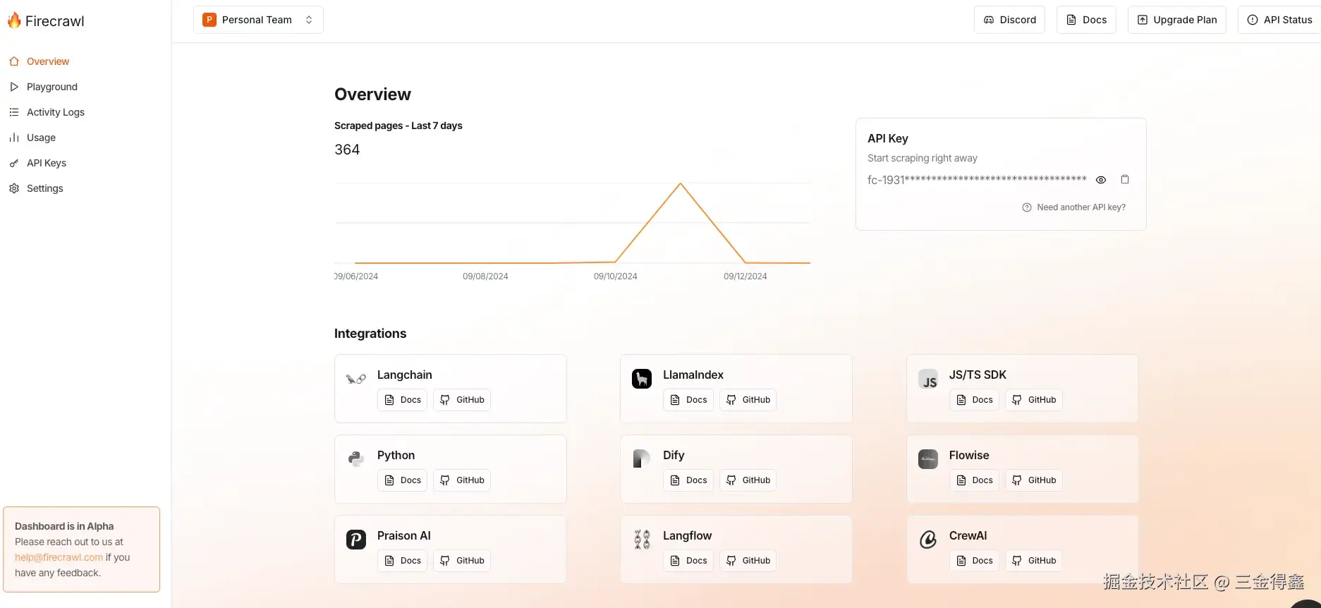 在注册登录之后,会进入到个人的概览页面,在这里能看到你的 API Key 和 7 天爬取日志 :