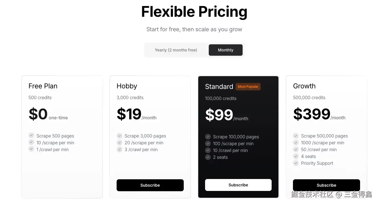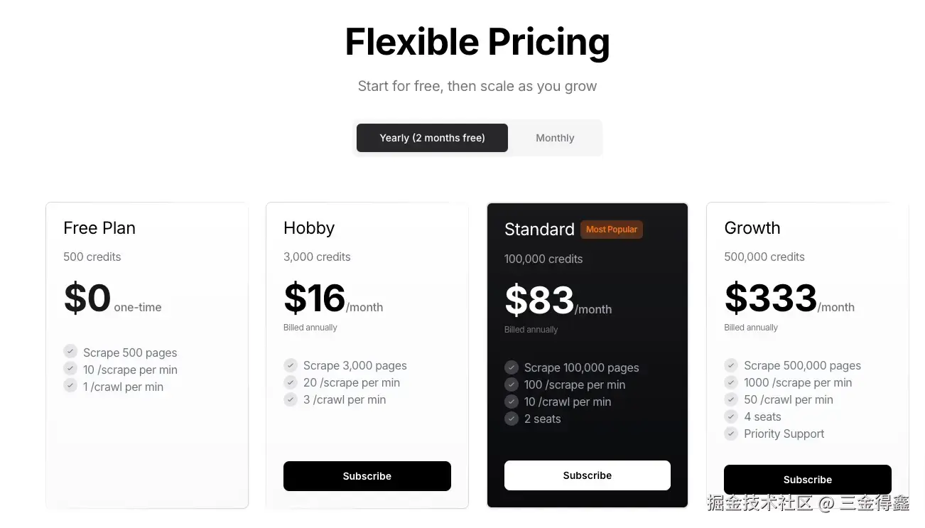 但是需要注意的是,Firecrawl API 并不是免费使用的,新注册的用户会得到 500 积分,如果这 500 积分用完了,就需要购买他们的服务,Firecrawl 的收费如下:
