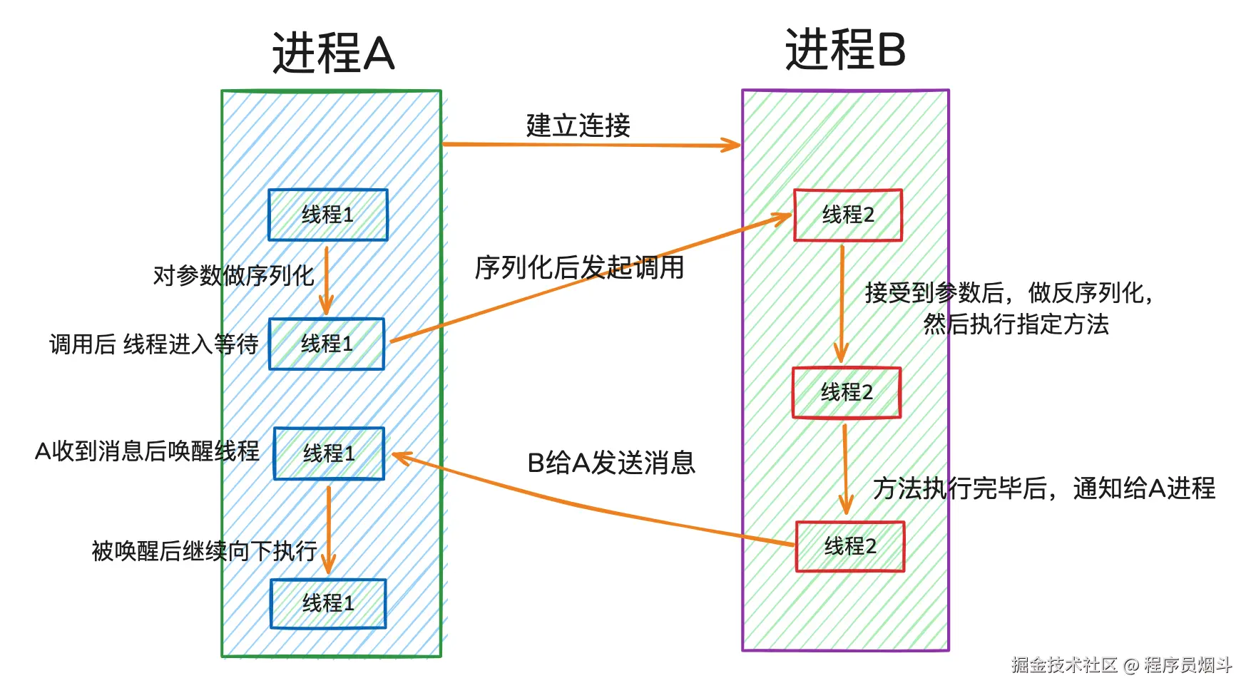 System.out.println("A进程将 请求的方法和参数 进行序列化,然后向B进程发起网络调用...");