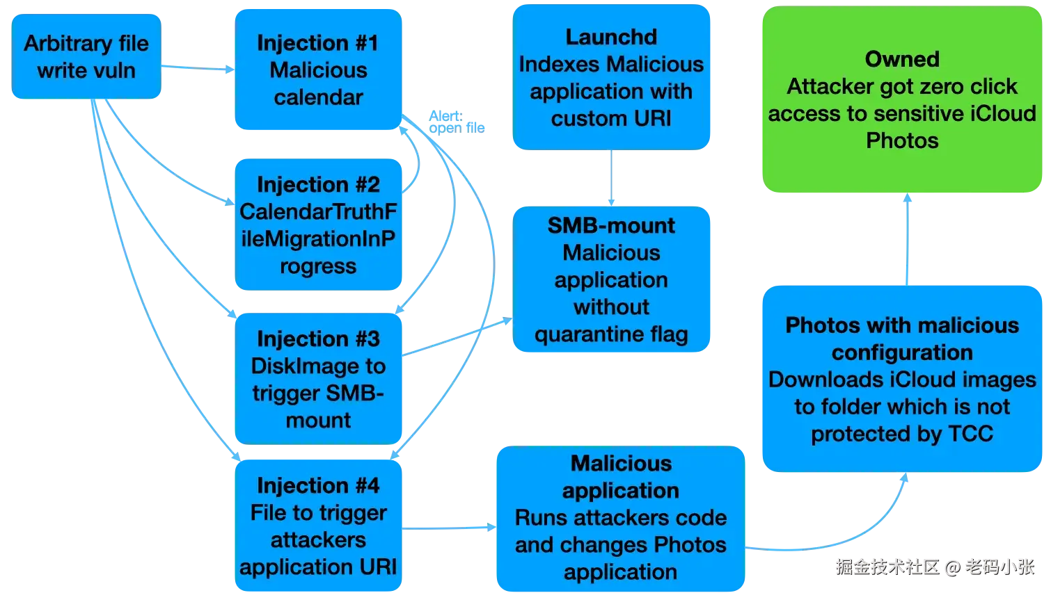 这个漏洞涉及到多个环节,包括macOS的日历应用、后台服务以及邮件程序等。攻击者通过链式攻击,逐步获取更高的系统权限。最终,他们可能完全控制你的设备,窃取数据、安装恶意软件,甚至进行更为复杂的攻击。