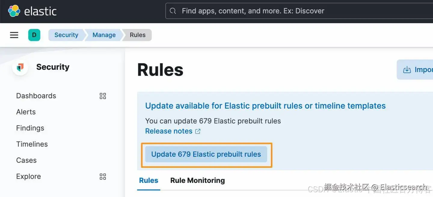 进入规则页面后,你可以通过点击 “Update Elastic prebuilt rules” 按钮来更新 Elastic 提供的所有预建规则。首次进入 “Manage rules” 部分时,将启用更新框架,如果 “Update Elastic prebuilt rules” 按钮不存在,请刷新屏幕。
