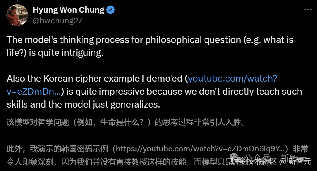 Hyung Won Chung 则表示,模型对哲学问题的思考过程颇为引人入胜。比如,生命是什么?
