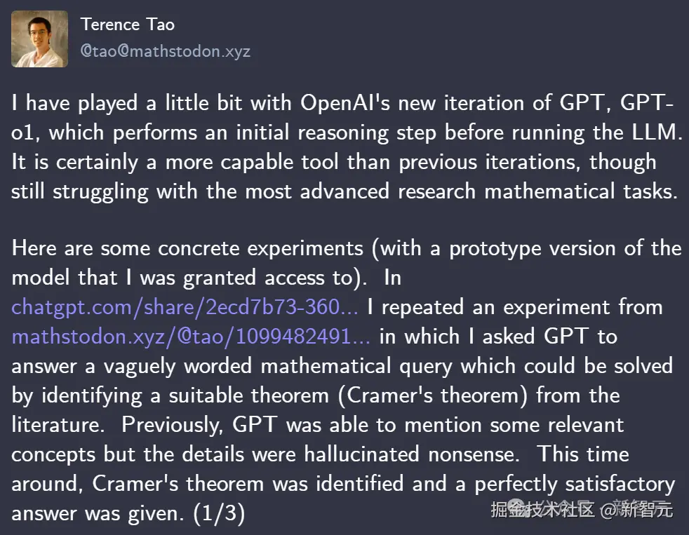 著名数学家陶哲轩也对 o1 进行了实测,发现自己向模型提出一个措辞模糊的数学问题后,它竟然能成功识别出克莱姆定理。