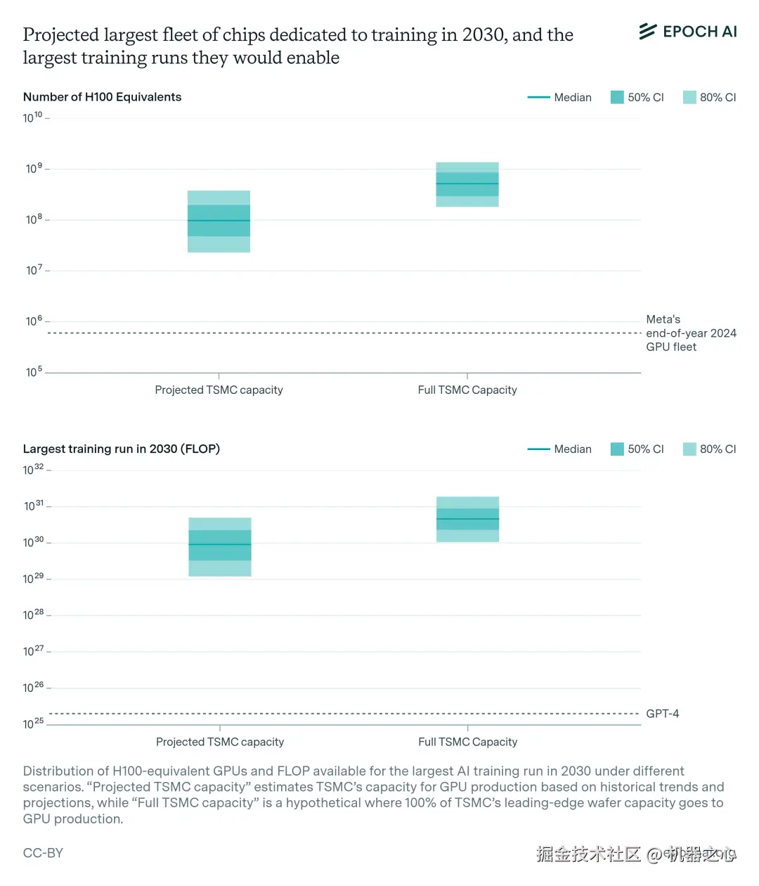 报告中假设了一种情况,即从现在到 2030 年,台积电 5 纳米及以下的全部产能都用于 GPU 生产。在这种情况下,潜在计算量可能会增加一个数量级,达到 1e30 到 2e31 FLOP。这一上限基于当前的晶圆产量预测,说明了如果完全解决封装、HBM 生产和晶圆分配方面的现有限制,对人工智能训练能力可能产生的最大影响。图 4 展示了这些估计值,并列出了其背后的假设。