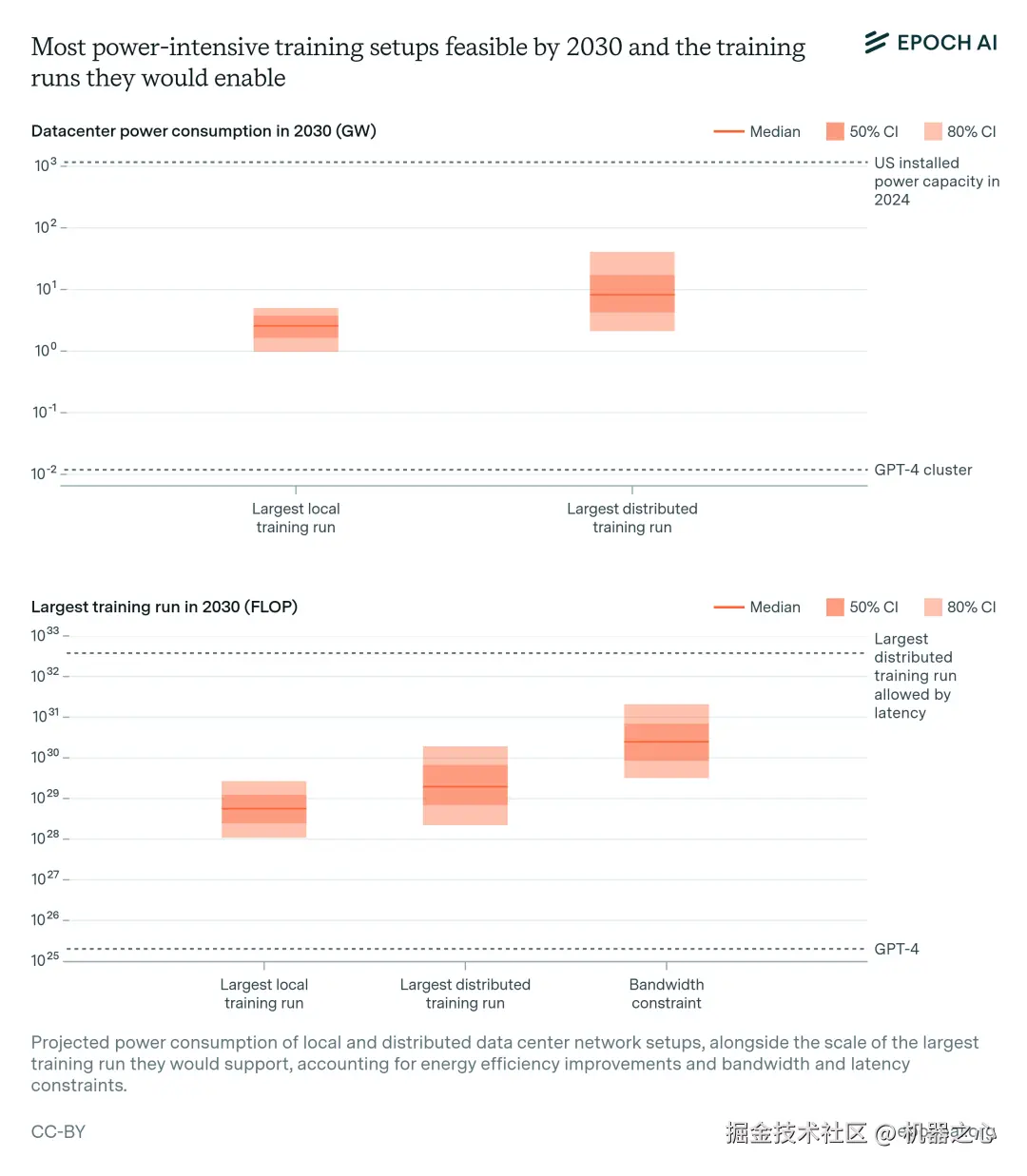 人们已经讨论过,到 2030 年数据中心园区达到 1 至 5 GW 的计划,这将支持 1e28 至 3e29 FLOP 的训练运行(作为参考,GPT-4 可能在 2e25 FLOP 左右)。地域分布式训练可以利用多个地区的能源基础设施,进一步扩大规模。根据目前美国数据中心扩张的预测,美国的分布式网络可能容纳 2 到 45 GW,假设数据中心之间有足够的带宽,则可支持 2e28 到 2e30 FLOP 的训练运行。除此之外,如果提前 3 到 5 年进行规划,愿意支付新发电站成本的参与者可以获得更多电力。