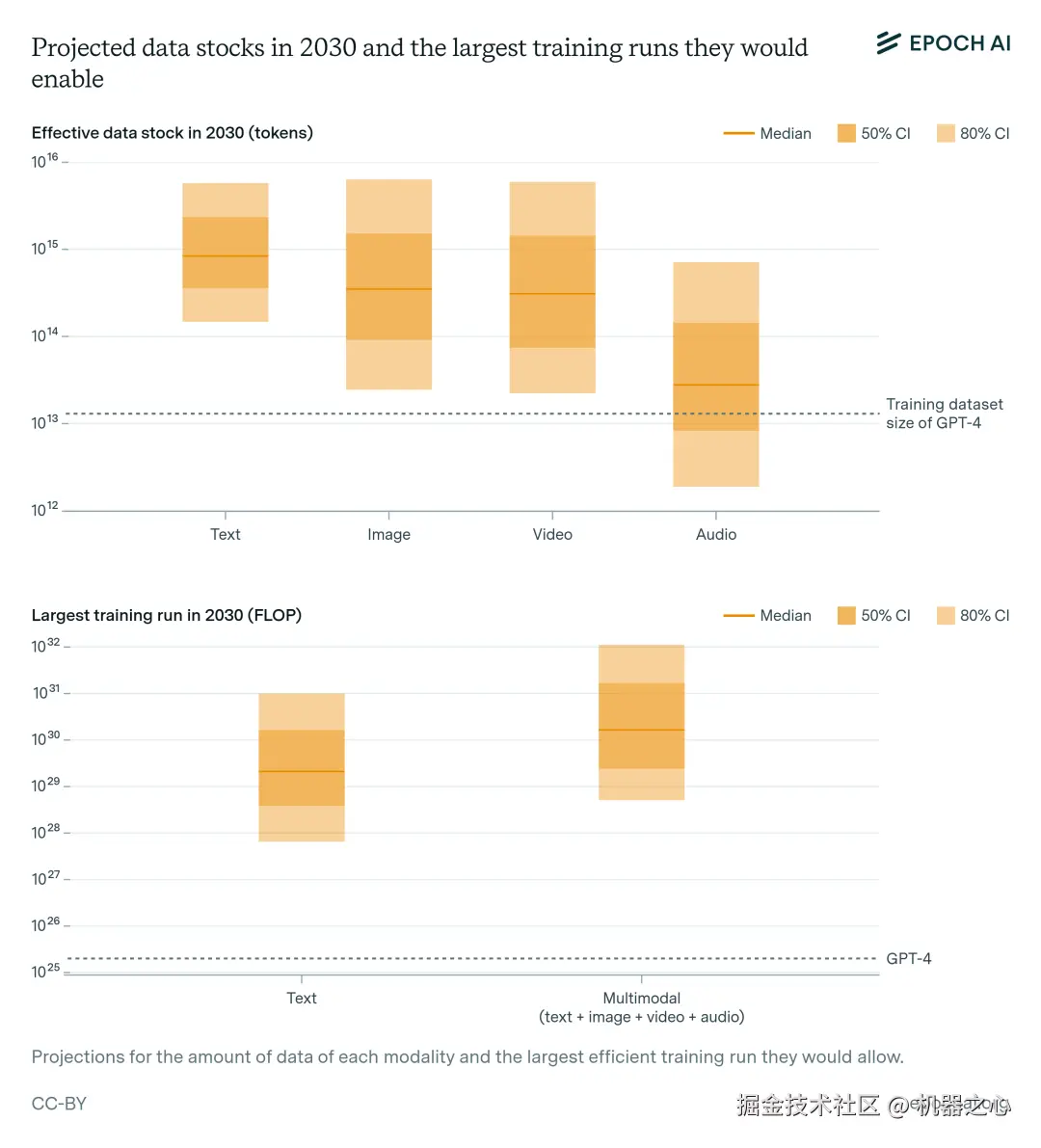 上文讲到了人工智能扩展的四个主要瓶颈。如果将它们放在一起考虑,则意味着到本个十年末,训练运行高达 2e29 FLOP 是可行的。这将代表着相对于当前模型的大约 10000 倍的扩展,并意味着扩展的历史趋势可以不间断地持续到 2030 年(图 7)。深色阴影框对应四分位数范围,浅色阴影区域对应 80% 置信区间。