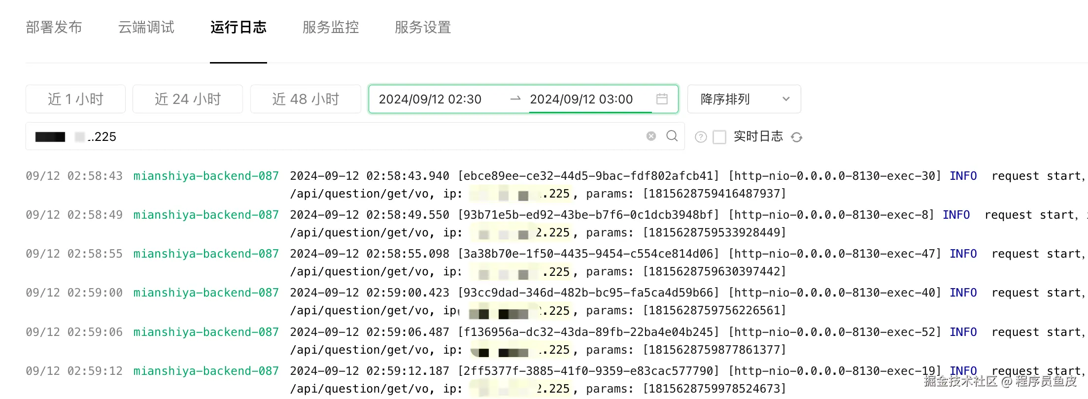 当然是看日志了!开发线上系统,肯定要有 IP 访问请求的日志记录。我直接在业务服务器的日志中根据 IP 和时间段进行筛选,就看到了该用户发送的请求和参数,什么时间访问了哪道题目都很清楚: