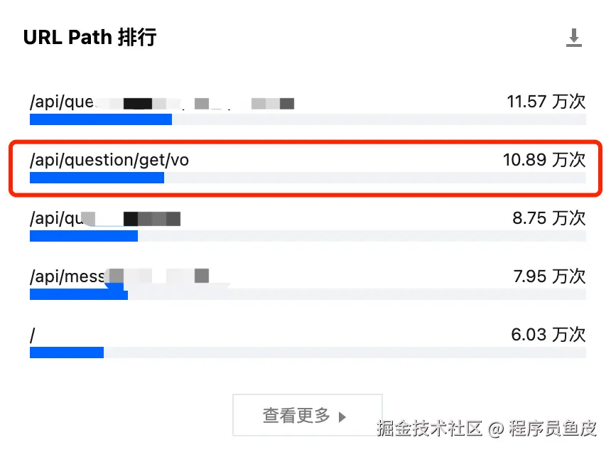 那这些 IP 都在请求什么资源呢?通过监控查看 URL 路径访问排行,发现获取题目信息的接口被调用了 10 万多次!