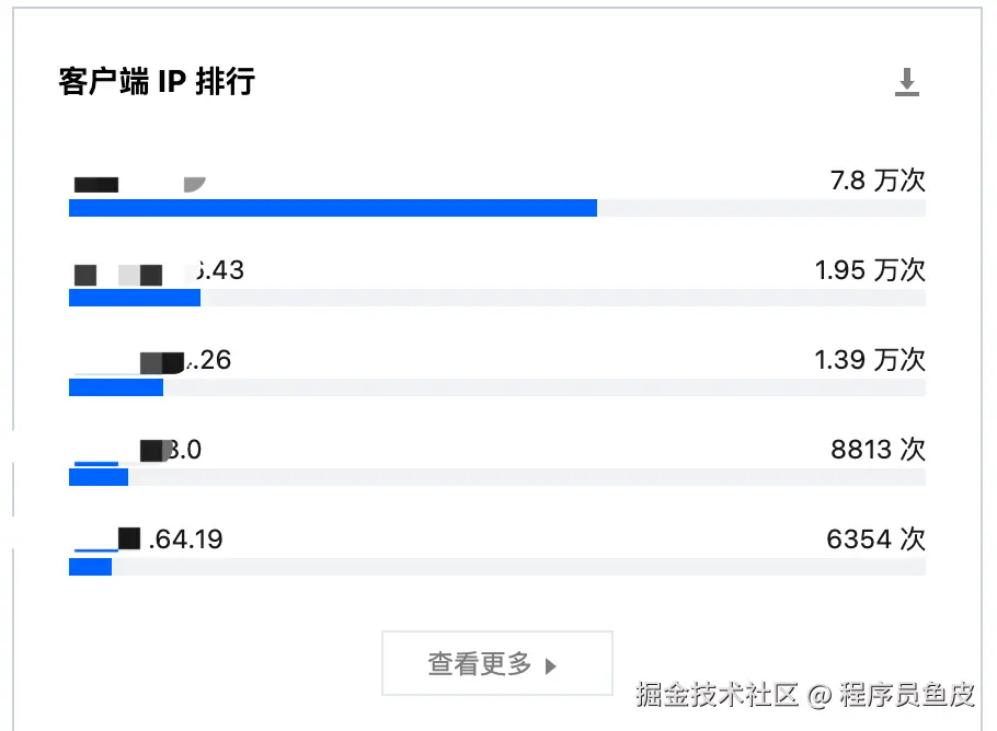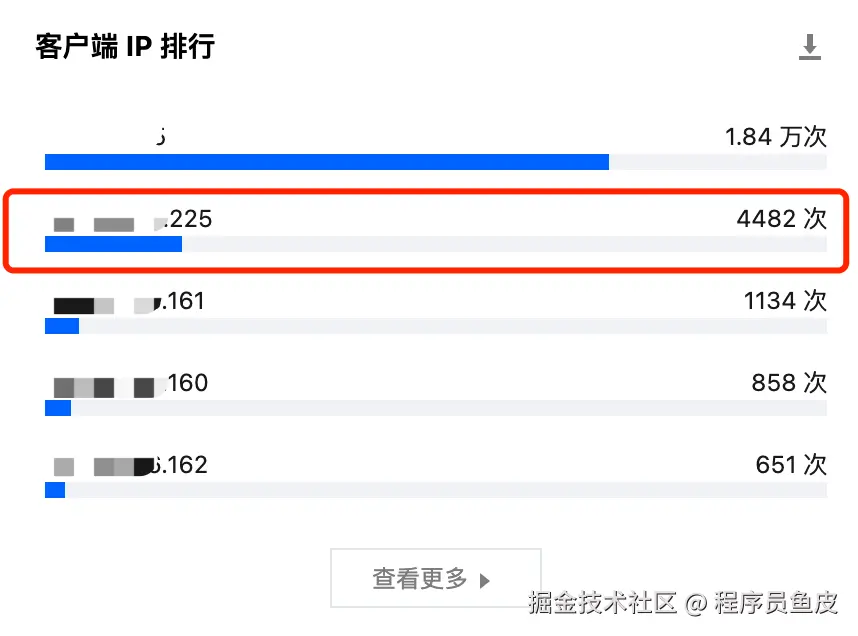 比如这次事件当天,我先通过系统云服务的监控看了下近 6 个小时向我们发送请求的客户端 IP,除去第一个是我们自己的 IP 外,其他几个 IP 的请求数都远超我们的业务平均值,显然这些 IP 不对劲!