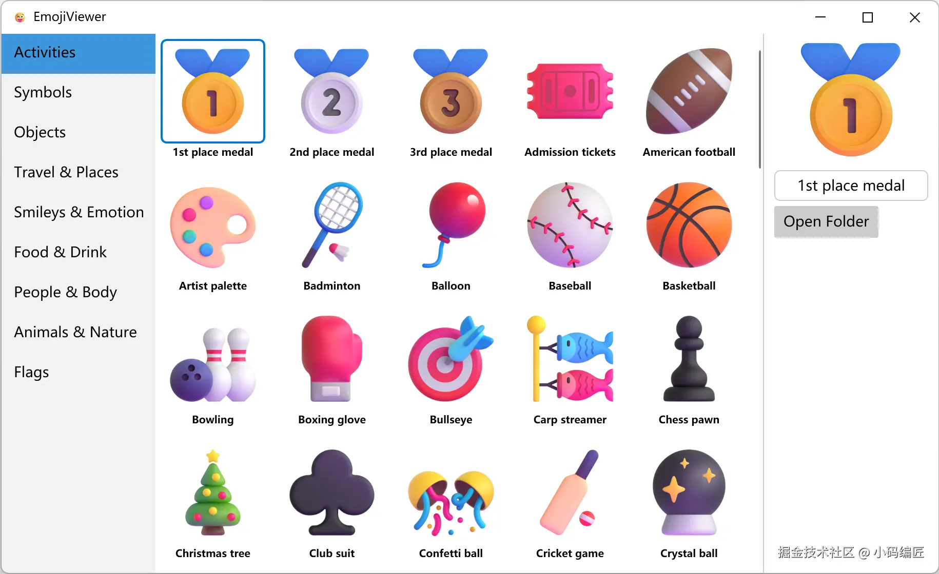 fluentui-emoji 下的 assets 文件夹下的每一个子文件夹对应一个 Emoji 表情文件夹,表情文件夹里面的 metadata.json 文件储存着 Emoji 表情的元数据。3D 文件夹里面储存的是 256x256 的 png 图片,其他文件夹储存的是 svg 矢量图片。然后要做的就是遍历每一个文件夹,解析里面的元数据和图片文件