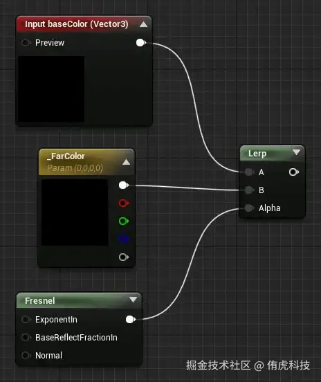 要实现不同距离的颜色渐变我们可以直接使用菲涅尔数值来插值颜色,因为我们可以把水面看作是法线朝上的平面,菲涅尔代表的视线入射角大小正好与水面距离的远近成负相关,且数值范围在(0,1)区间。下面再Unity与UE中实现这个简单效果。