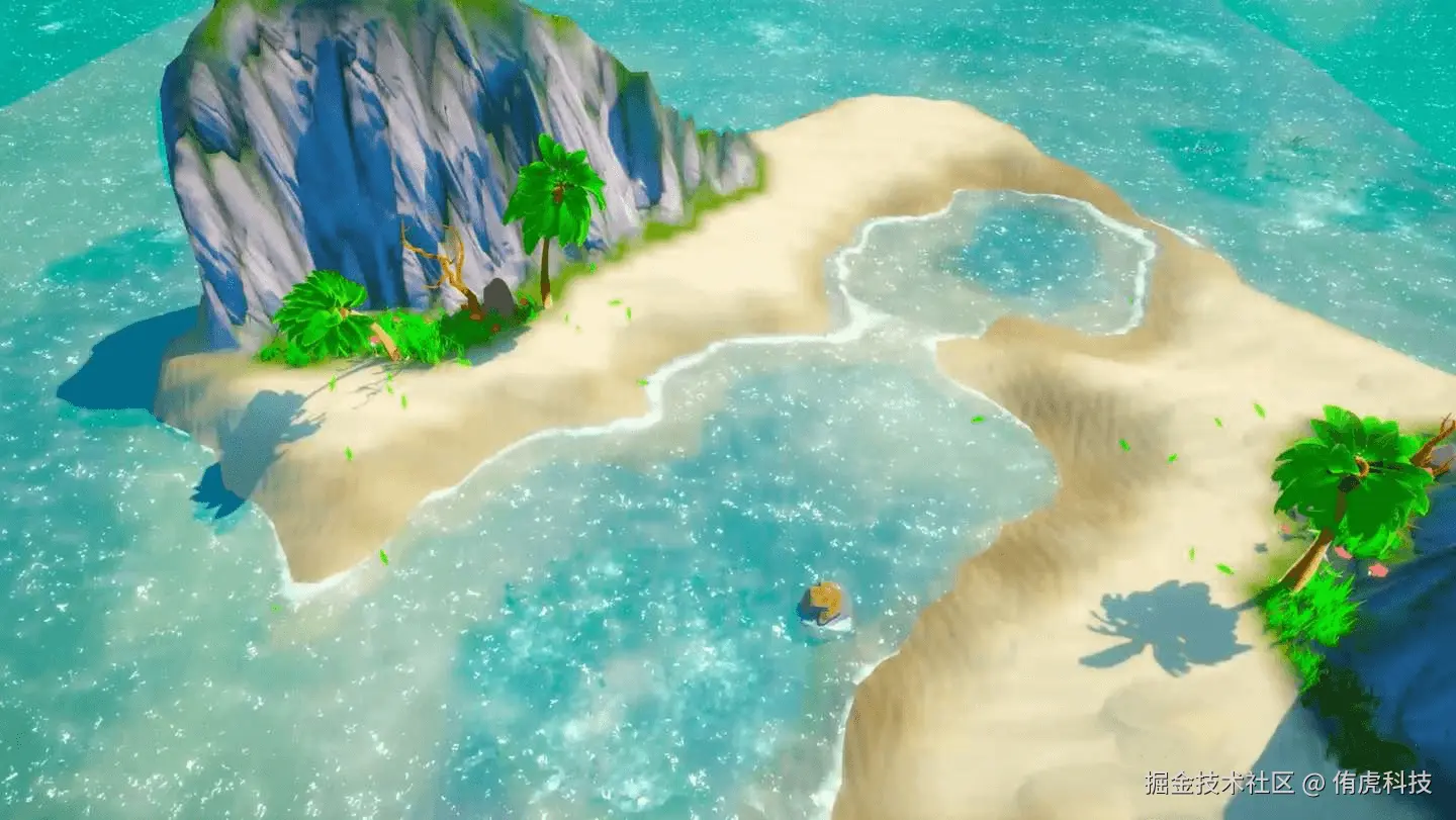 我把泡沫简单分为浪花泡沫与边缘泡沫两种,浪花泡沫主要指随着波浪飘动的泡沫,主要分布在浪尖周围;边缘泡沫主要指水面与其他物体交界处产生的泡沫,包括与岸边的交界处,以及与可移动物体(例如玩家)的交界处。泡沫的表现有许多作用,其明亮洁白的颜色在水中较为突出,可以以近似线条的形式描绘出海边蜿蜒曲折的形状,其来回飘荡的节奏可以增强波浪的动势。