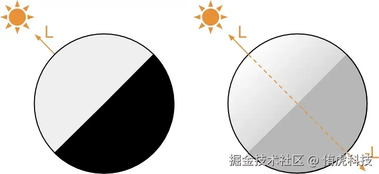 快速次表面散射的基本思路是把光源分为两部分:一部分光源可看作不透明物体受到的所有光源照射(我们把它看作图中的L),另一部分光源是前面那部分光源进入半透明物体后所内部散射的光源(我们把它看作是图中的-L)。从图中可以看到受-L光影响的物体,其背光面将会受到-L光柔和的照射。