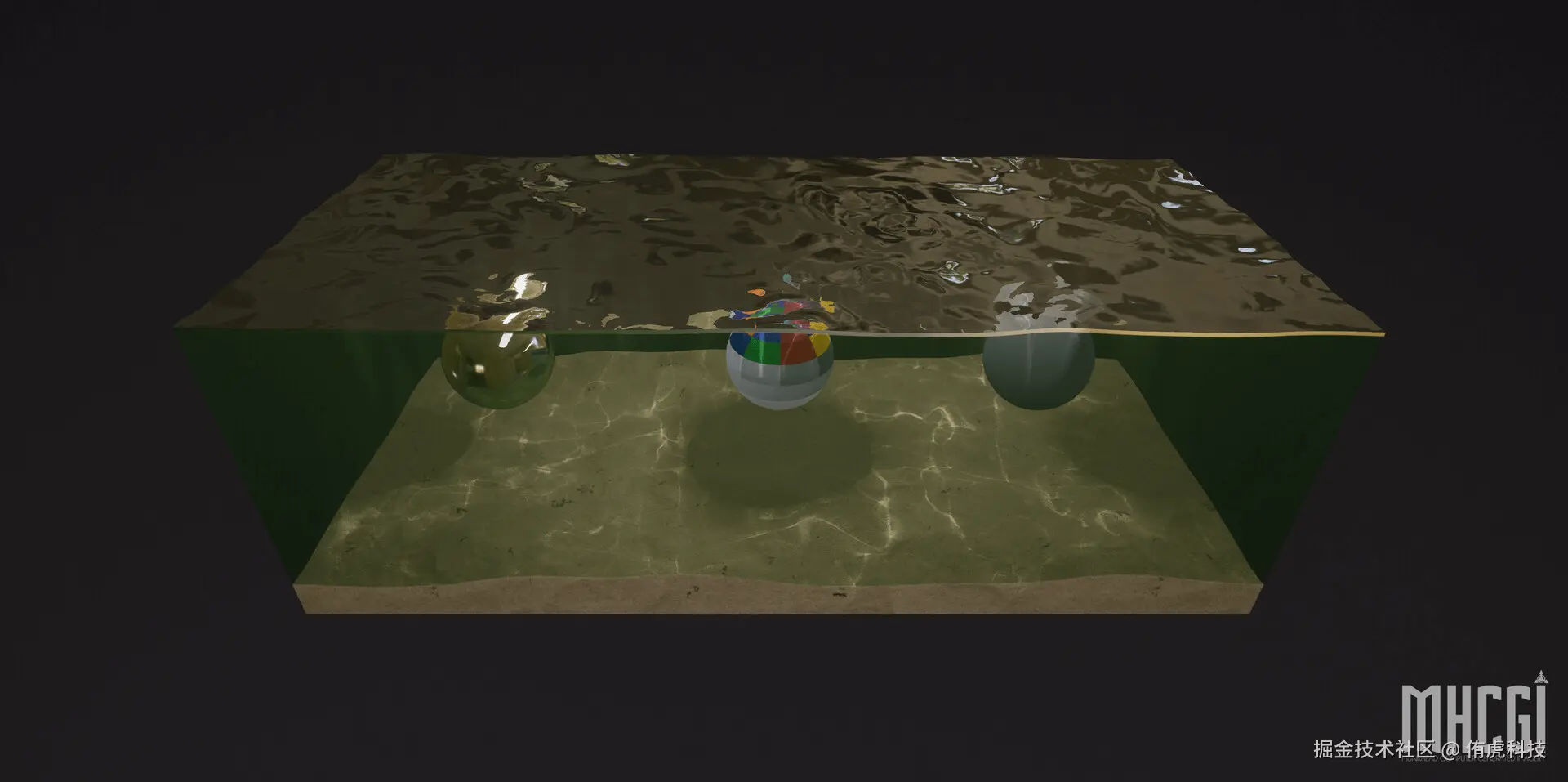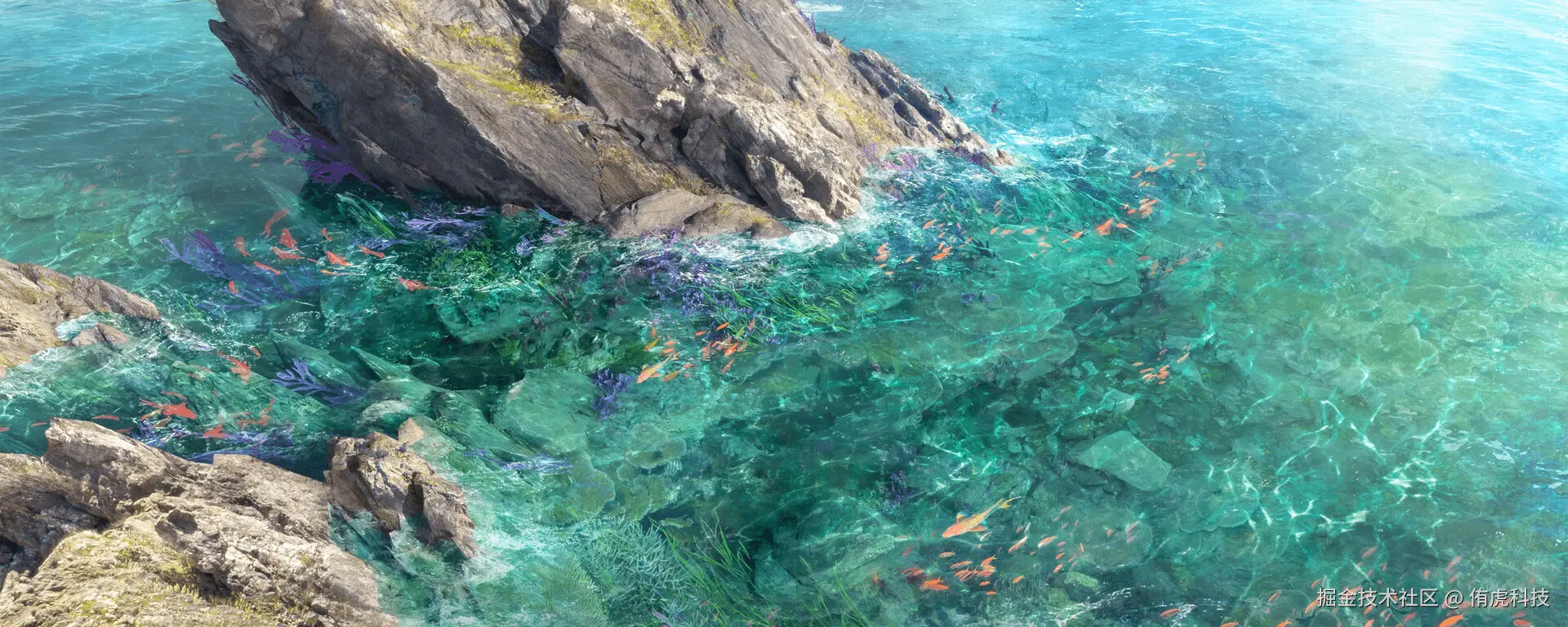 焦散是折射现象的延申,当光线从空气射入水中时,光线会发生折射并产生焦散效应。真实的焦散不仅会产生耀眼的光斑,还因不同颜色的光线在折射时受到不同程度的偏离,出现一种类似彩虹的效果。焦散效果可以增强物体的透明感和真实感,使画面亮部细节更丰富,并且水底朦胧扭曲的焦散可以增强水体的立体感和动态感。