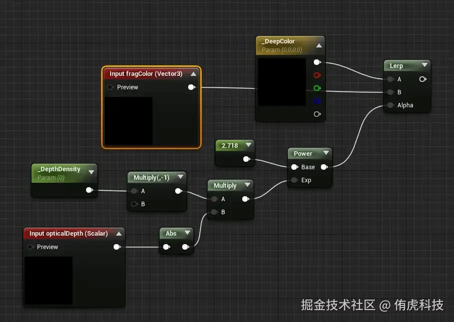 如果我们没有LUT纹理,我们可以选择方案二,用exp()函数处理深度值后用来插值我们在材质面板输入的水面颜色与水底颜色。