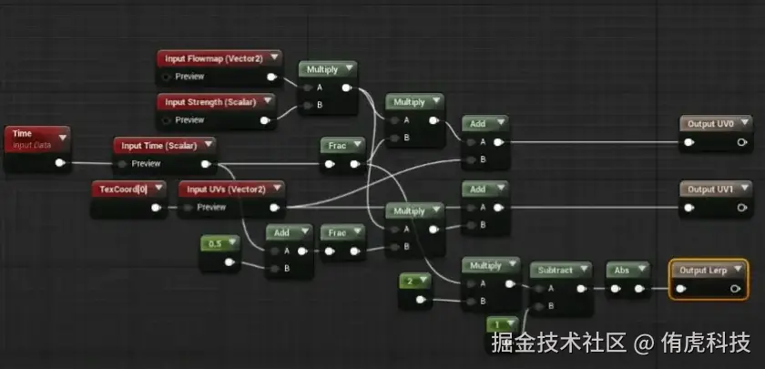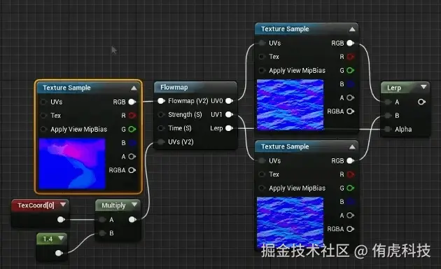 下面提供了一个实现UV动态偏移的简单函数,用函数实现UV随时间的偏移后就可以直接采样水纹法线了。