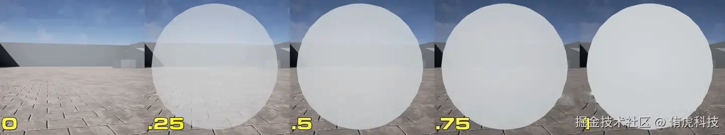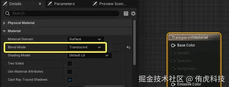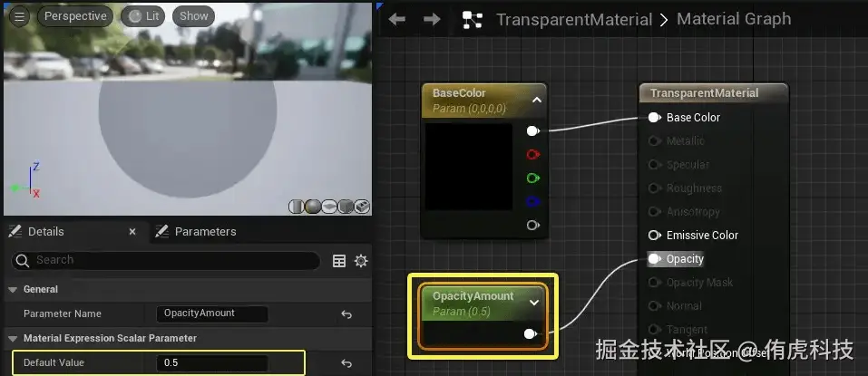 UE: 只需要设置材质的Blend Mode为“Translucent”或“Additive”(具体情况根据您的需求而定),然后将透明度数值连接到材质的透明度控制的“Opacity”接口即可。